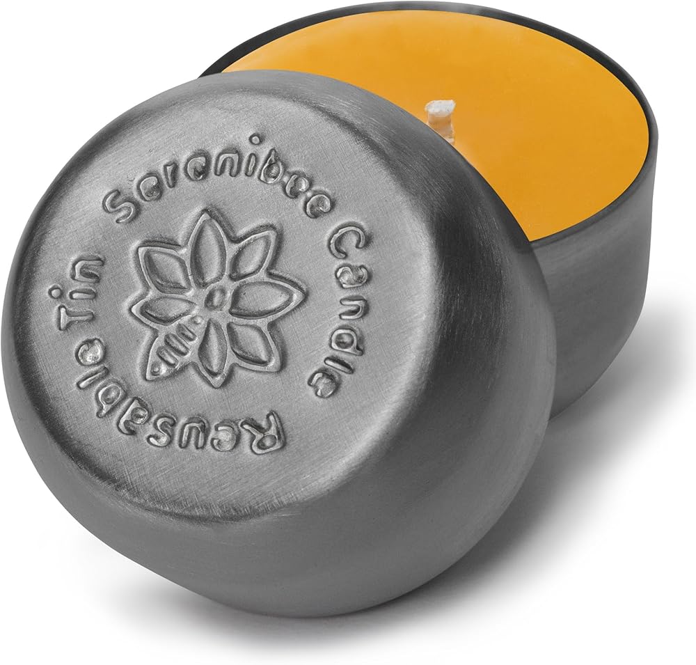 Our same distinctive tea lights with their very own custom fit reusable steel candle holder. These will fit inside our glass candle holders or any other candle holder where you wish to burn your Serenibee Tea Light. These beeswax tea lights are perfect for anyone who loves burning candles but is also concerned about keeping a healthy home environment. Other candles, especially those made from paraffin and those that contain artificial fragrance, can release toxins as they burn, which we along with our children and pets then inhale. Serenibee Candle products are made from 100% beeswax and give off a warm honey scent. Many people who have fragrance allergies or are prone to migraines and can't burn other candles can tolerate beeswax. Serenibee Candle is also committed to contributing to a healthy environment. That's why our products are packaged in reusable cotton bags and do not contain standard disposable plastic or aluminum tealight cups. Our tealight candle holders are reusable and when properly cared for, will perform for years to come. Candles are hand-poured and some variation is normal. Made in Montana with wax from Montana bees.