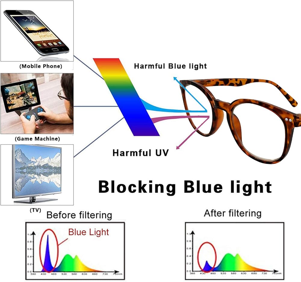 • نظارات زرقاء تحجب الضوء للنساء: تحجب الضوء الأزرق وعدسات UV400، تخفف من التعب البصري وعدم الراحة الناتج عن مشاهدة الهواتف المحمولة والأجهزة اللوحية والألعاب والعمل تحت أضواء الفلورسنت مع حماية من الأشعة فوق البنفسجية فئة A وB وتقليل الوهج.