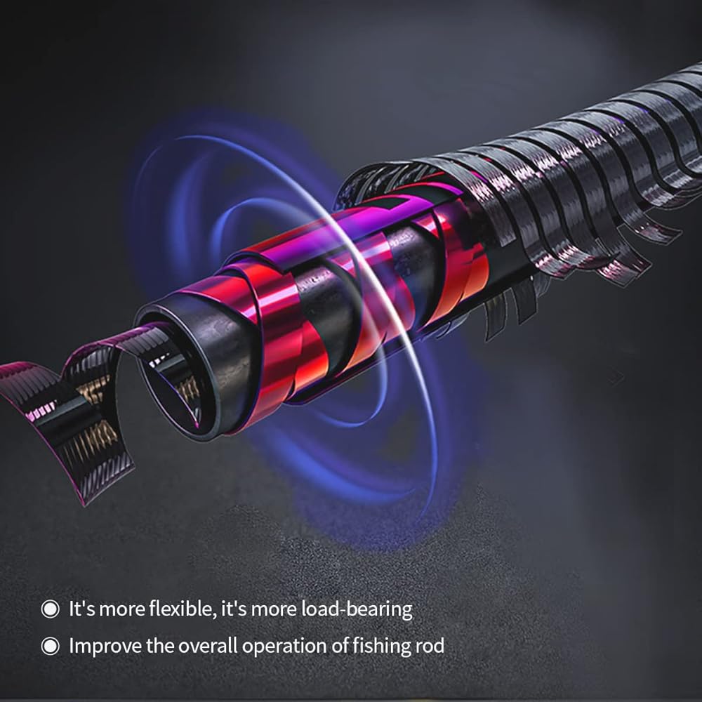 7 طبقات من القماش الكربوني المتقاطع - تجعل القضيب متوازنًا أقوى وأكثر ليونة. إنها أكثر مرونة وأكثر تحملاً. يحسن التشغيل العام لقضيب الصيد.