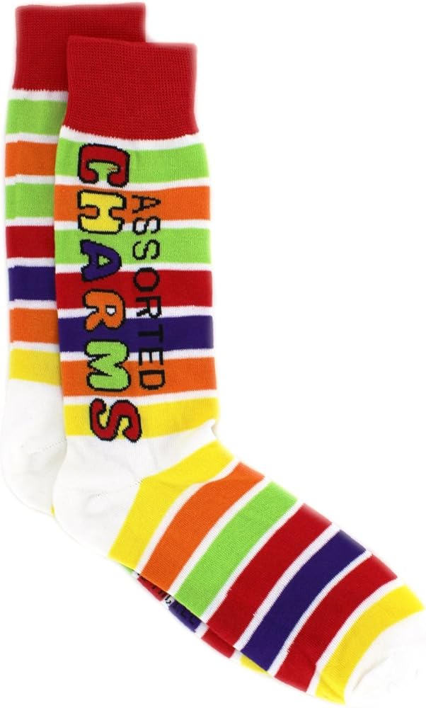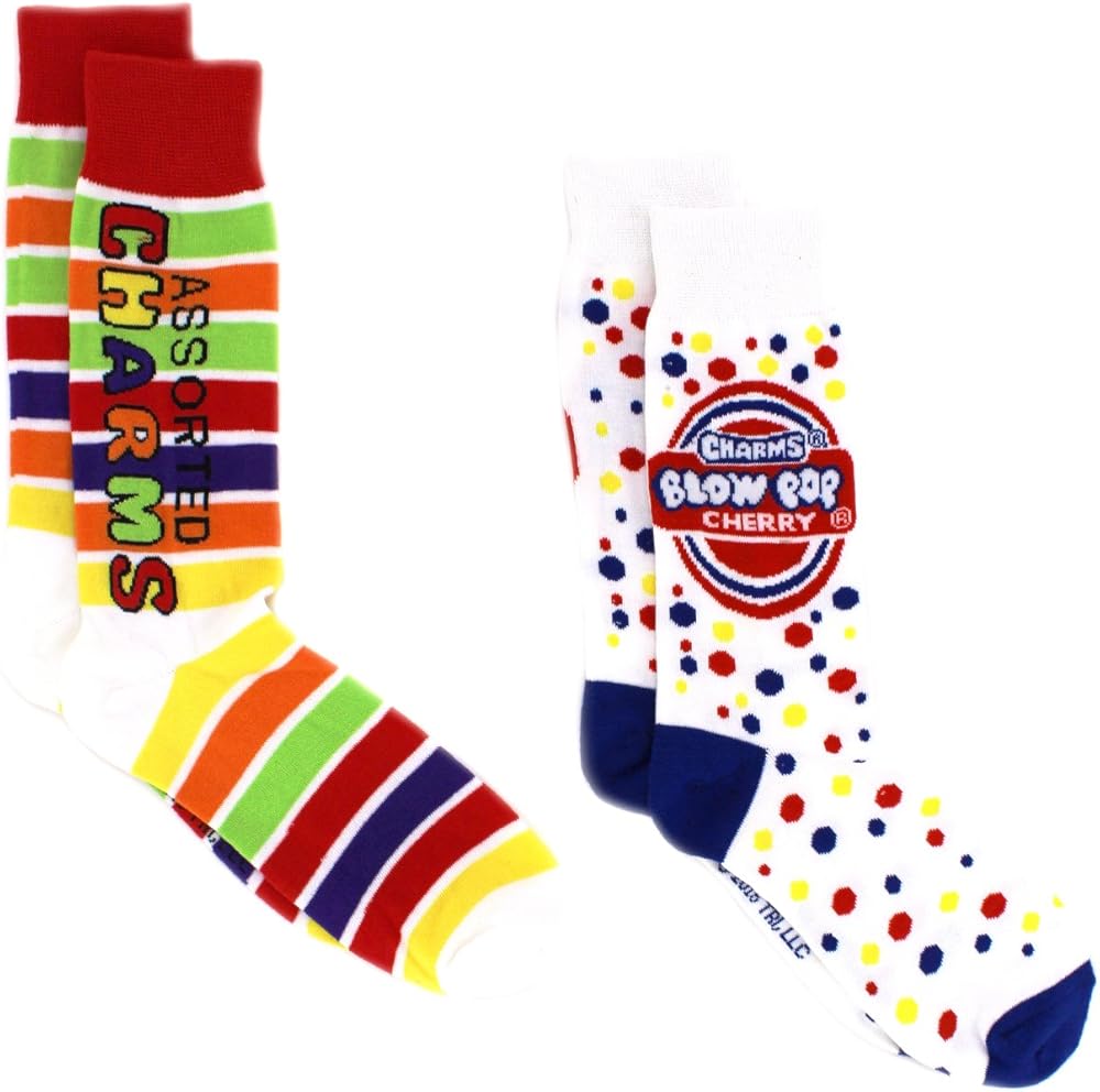 Make your day a little sweeter by adding candy to your daily attire! These colorful adult sized crew socks feature your favorite candy. Two pairs in each adult size crew style sock set provide excitement, making each day a little more fun! Choose your favorite sweet for each day! Featuring all your favorite candies like Charms, Blow Pops, Dots, Tootsie Roll, and Sugar Daddy! Choose your favorite candy set, or collect them all!
