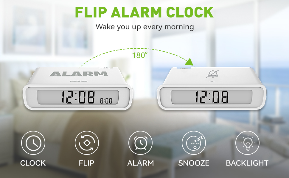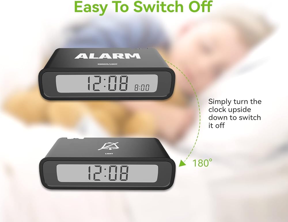 【ساعة منبه بتصميم قلاب للتشغيل والإيقاف】 - ساعة المنبه قابلة للعكس بحيث تقوم ببساطة بقلب الساعة وسيتم إلغاء تنشيط المنبه/الغفوة. يعرض أحد الجانبين المنبه والوقت، ثم اقلبه إلى الجانب الآخر، وسيتم إلغاء تنشيط المنبه ويعرض الوقت الحالي فقط. اقلب ساعتك حتى يصبح جانب "المنبه" مرئيًا. ثم تأكد من أن الجانب OFF متجه للأعلى لإيقاف تشغيله.