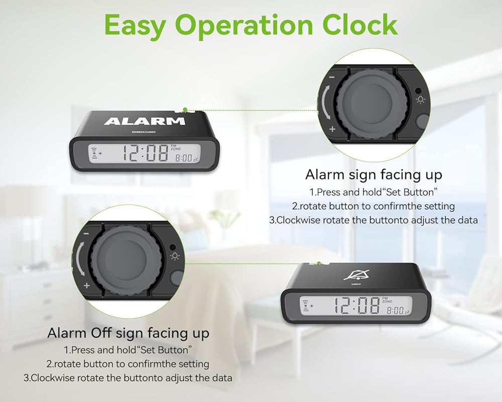 【ساعة تشغيل سهلة】 - بسيطة ولكنها فعالة، زر واحد يفعل كل شيء. اضغط لبدء الإعدادات، ثم قم بالتدوير لضبط القيمة. عندما يرن المنبه، المس الجزء العلوي وسيغفو على فترات زمنية مدتها 5 دقائق.