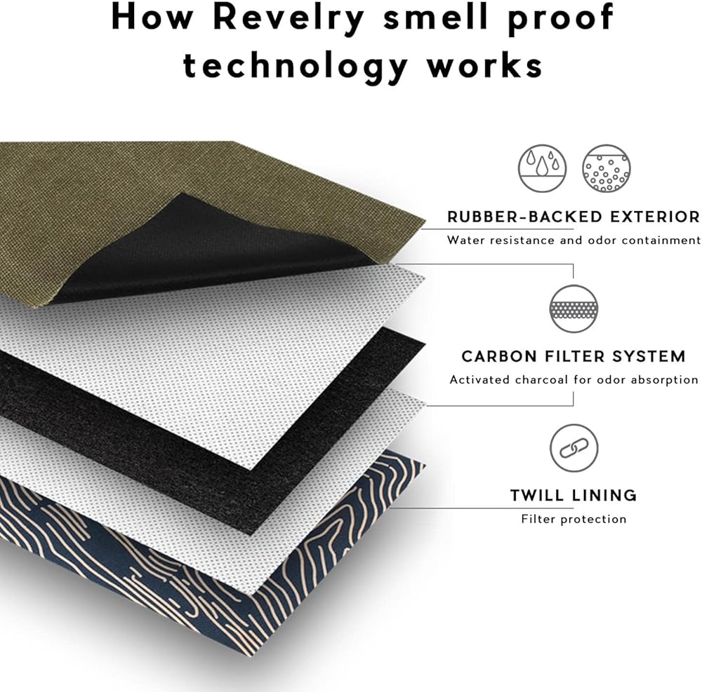 تقنية مقاومة للروائح الكريهة، تم تصميم كل حقيبة من ريفيلري بشكل فريد باستخدام تقنية نظام فلتر الكربون من ريفيلري. يستخدم نظام فلتر الكربون الفحم النشط الممتاز والفلترات الاصطناعية لامتصاص جميع الروائح غير المرغوب فيها. بالإضافة إلى ذلك، تحتوي الطبقة الخارجية على دعامة مطاطية شديدة التحمل لاحتواء الروائح في الحقيبة، بينما يمتص نظام فلتر الكربون الرائحة. تتيح لك هذه الميزات التخزين والتجول بحرية مع العلم أنه لا يمكن لأي شخص أن يشم ما قمت بعبئته بالداخل.