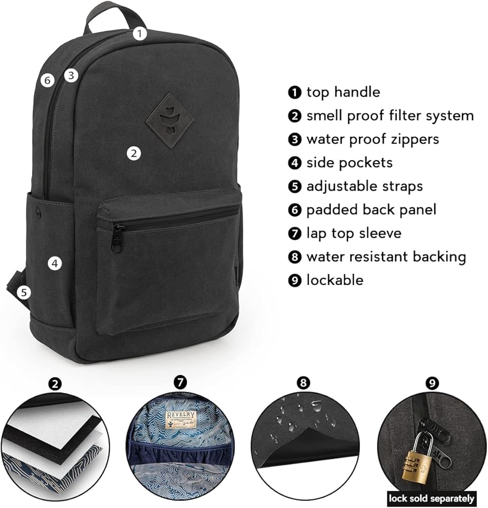 حقيبة الظهر ذات المقاس التقليدي مقاومة للرائحة ومقاومة للماء. مع 18 لتر من المساحة (17 بوصة × 13 بوصة × 5 بوصة)، يمكن أن تناسب الحقيبة جميع احتياجاتك بأمان وحفظ. بالإضافة إلى ذلك، هناك رؤوس بسحاب قابلة للقفل، ومقسم لاب توب، وجيب سري حتى تتمكن من تقسيم وحمل كل شيء في كل مكان دون قلق. هذه الحقيبة مثالية للمدرسة أو العمل أو التنزه أو أي مغامرة أخرى تقوم بها.