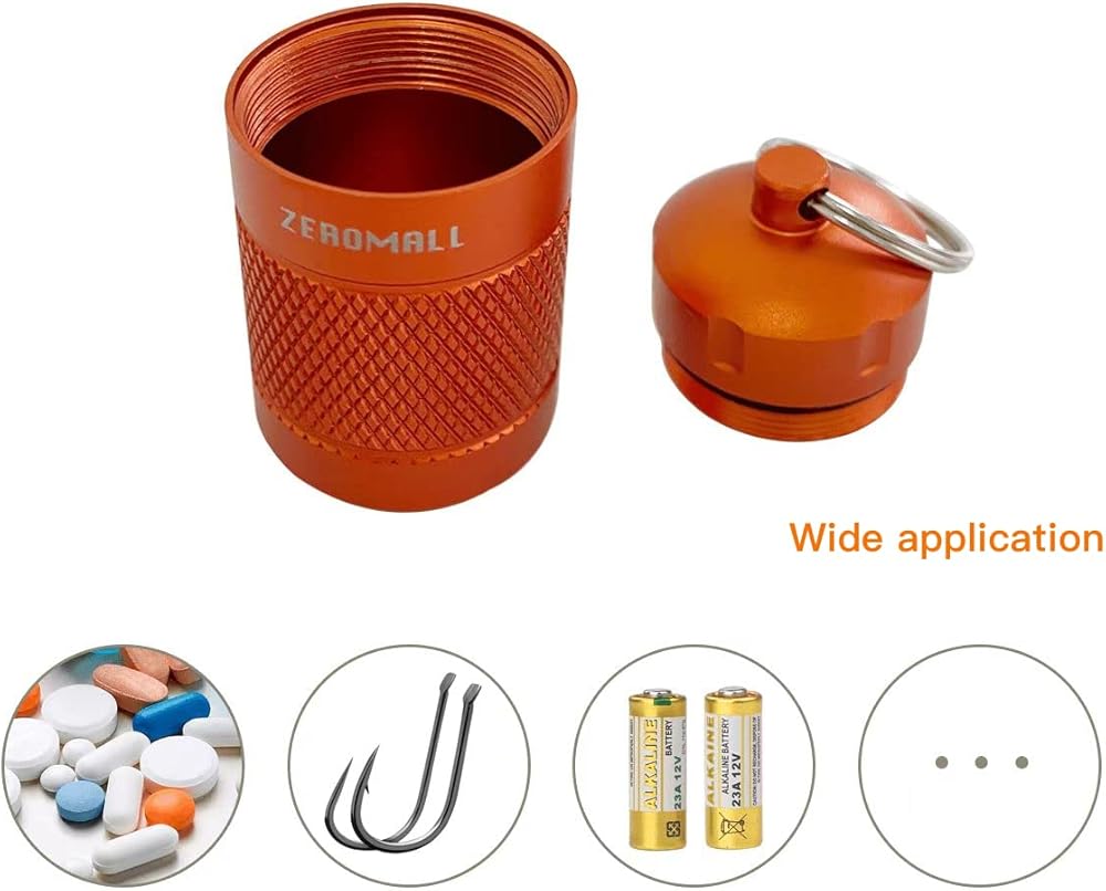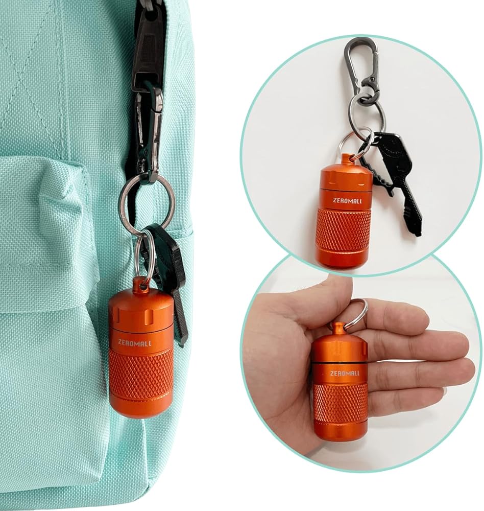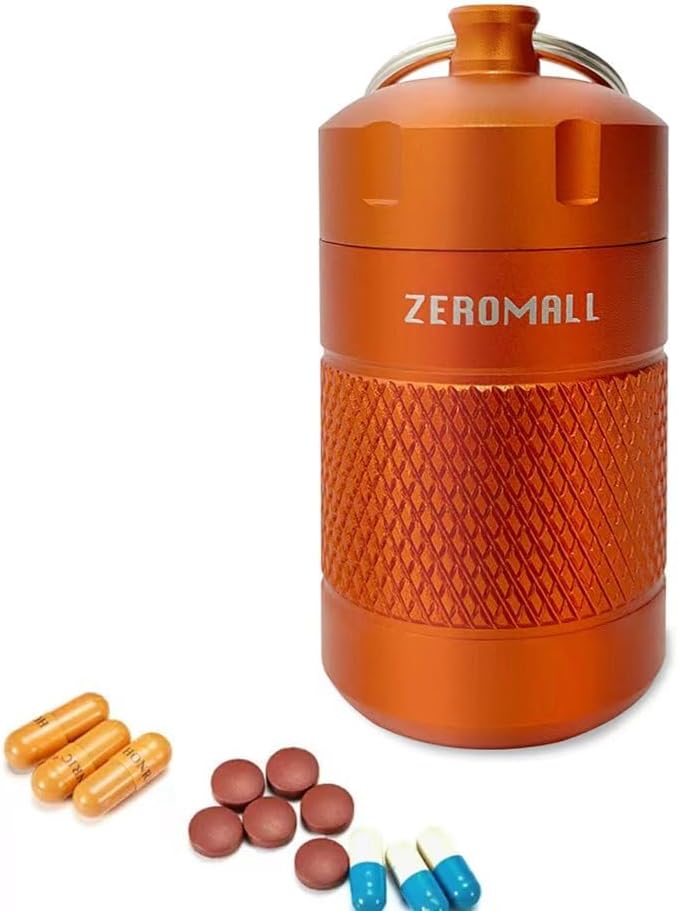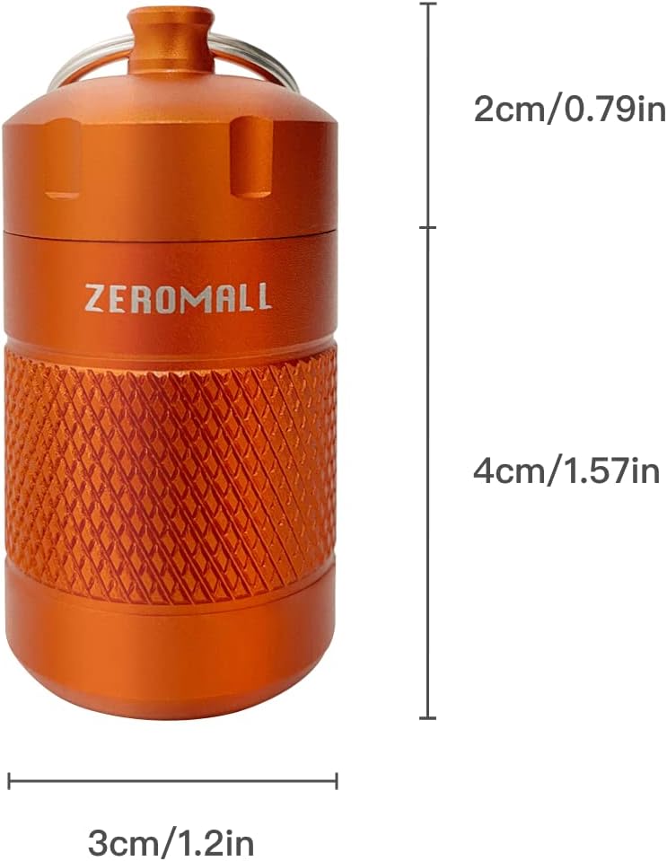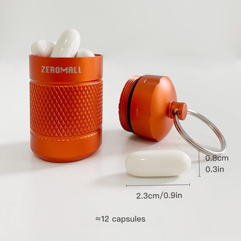 منظم حبوب محمول من خليط معدني من الالومنيوم مقاوم للماء مع سلسلة مفاتيح للرياضات الخارجية والتخييم والمشي لمسافات طويلة والسفر، 1.2×1.2×2.2 انش (قطعة واحدة، برتقالي)