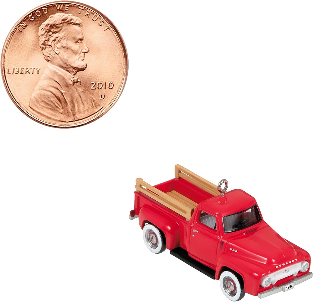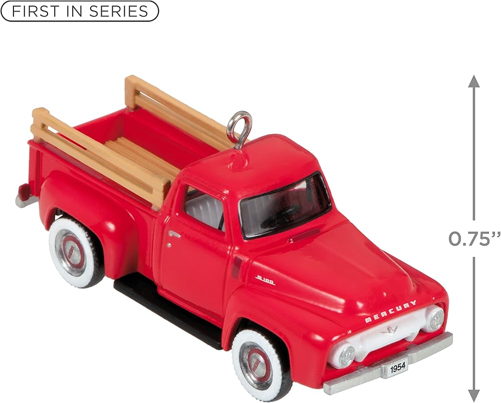 Take a pick-up truck fan back in time with this 1954 Mercury M-100 Christmas tree ornament. This mini metal design of the enduring workhorse in candy apple red has wheels that turn and classic features like a rounded front grill and wood-style side rails. Year-dated 2023 on rear license plate. Ford Motor Company Trademarks and Trade Dress used under license to Hallmark Cards, Incorporated and its subsidiaries.