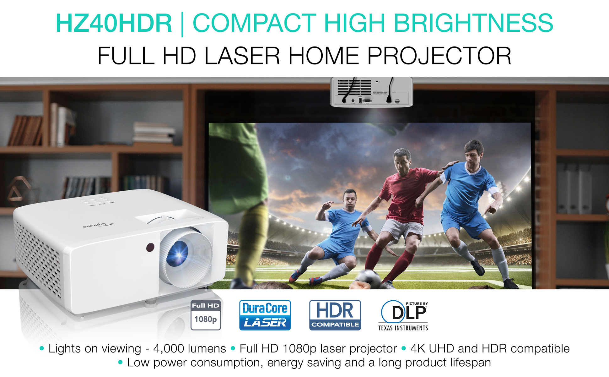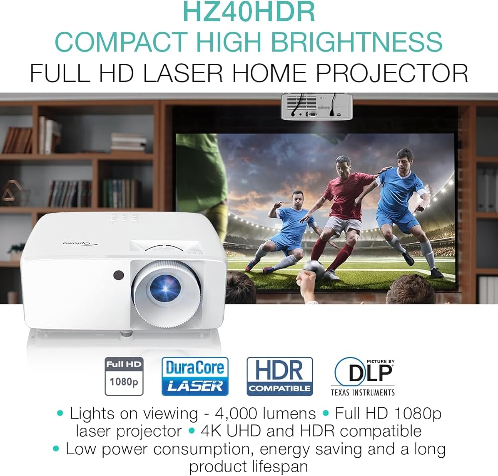 The Optoma HZ40HDR is a compact but powerful home theater and gaming projector that offers an immersive viewing experience. It utilizes DuraCore laser light technology for a dependable light source with up to 30,000 hours of maintenance-free operation and an IPX6 dust resistance rating for enhanced durability. Its long throw lens projects a 120" image from 13'10" away and can be placed up to 32'9" from the projection surface, making it ideal for medium to large size spaces. With 1080p HD resolution, you can enjoy sharp and detailed content without any downscaling or compression. The HZ40HDR also boasts an enhanced game mode with lightning-fast response times and compatibility with 4K HDR input, which provides rich cinematic colors and an impressive 300,000:1 contrast ratio. This advanced projector is both compact and energy efficient, measuring just 8.5" x 10.79" and consuming only 45% of the power used by typical lamp-based projectors. It's equipped with dual HDMI connectors and a USB connector, making it compatible with a wide range of gaming consoles and streaming devices. And, the HZ40HDR offers lights-on viewing with an incredible 4,000 Lumens of brightness, allowing you to enjoy entertainment anytime, regardless of ambient light levels.
