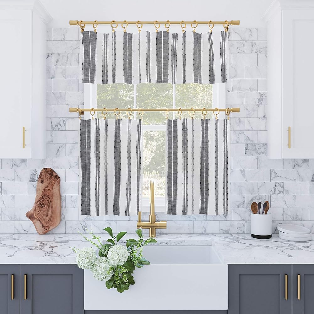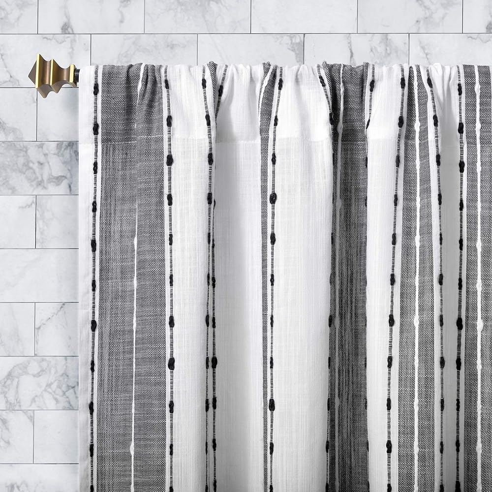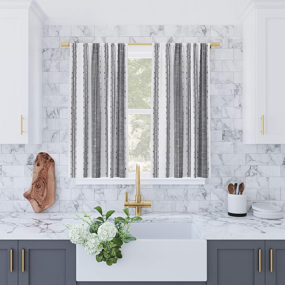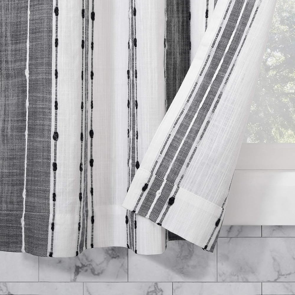 Infuse southwestern chic into any room of your home with the Cafe Curtain Pair from Archaeo. Featuring yarn-dyed vertical stripes, this slub textured semi-sheer cotton fabric gently filters light while enhancing privacy. Ideal for kitchens, bathrooms, or small windows, the pole top rod pocket design allows for simple slide-through installation on curtain rods up to 1.5” in diameter. Set includes two black/white tiers measuring 52" width by 36" length. Coordinating valances or swag pairs are sold separately. Measure carefully before selecting your desired size. Rod not included. Hand wash using cold water. Use non-chlorine bleach when needed.