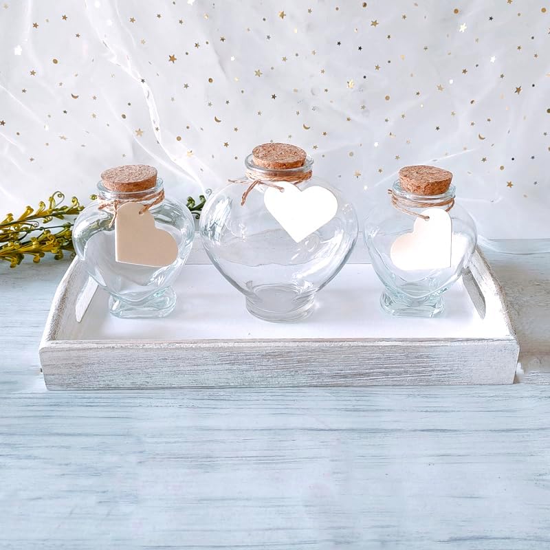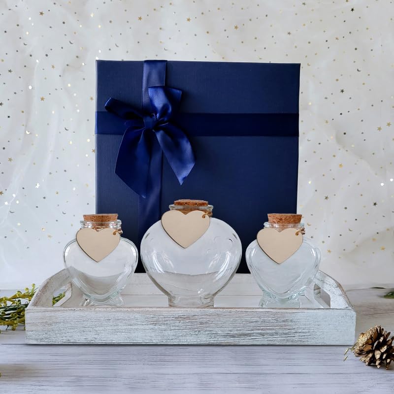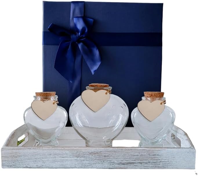 • مجموعة من أربع قطع متضمنة في صندوق الهدايا: 1 مزهرية مركزية (5.1 × 2.6 × 2.6 انش) مع فلين، 2 وعاء (6.3 × 2 × 2 انش) مع 2 فلين وصينية خشبية (9 × 4.3 × 2 انش). ستستوعب الزجاجة المركزية حوالي 2 باوند من الرمل. الرمال غير متضمنة.