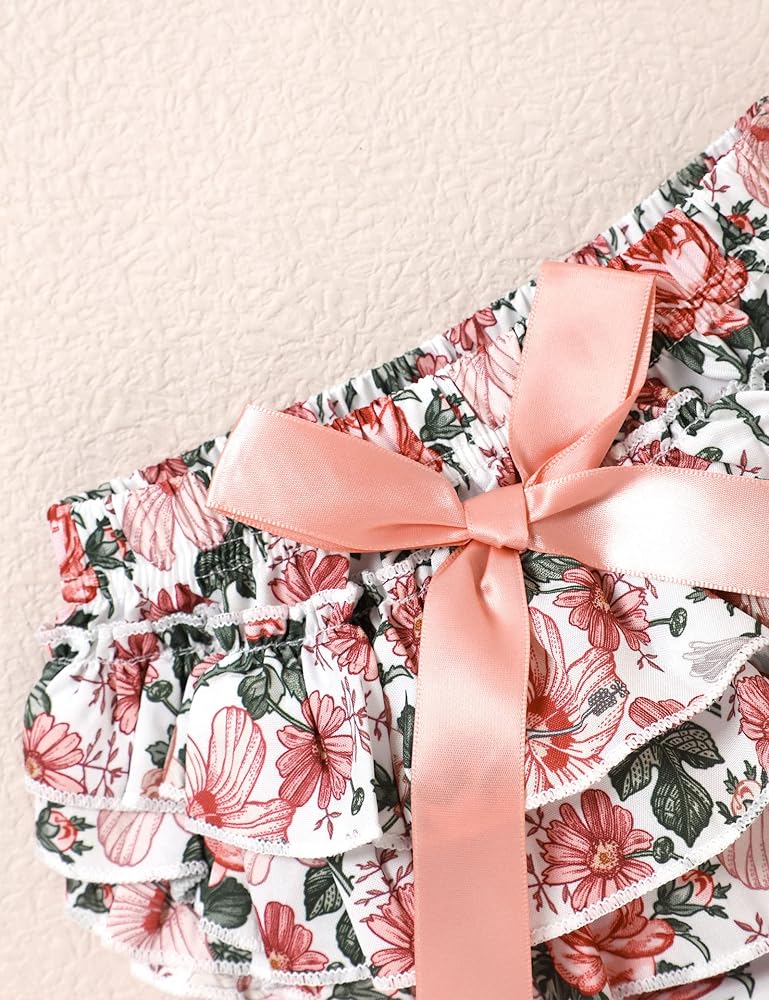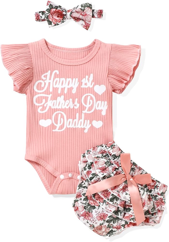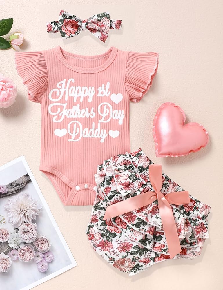 Feature: Happy 1st father's day letters ruffle short sleeve bodysuit,flower print skirt shorts, with cute headband, baby girl first fathers day outfit make your baby girl have a funny fathers day