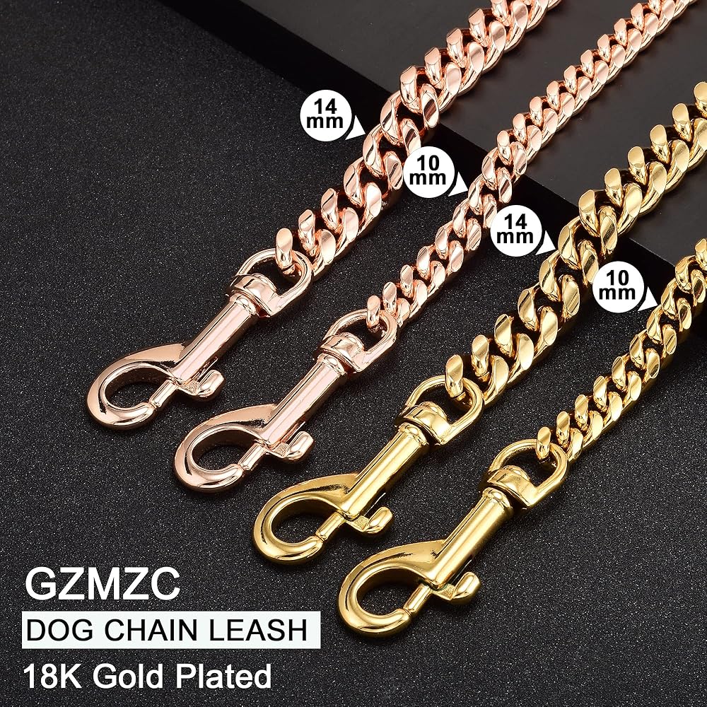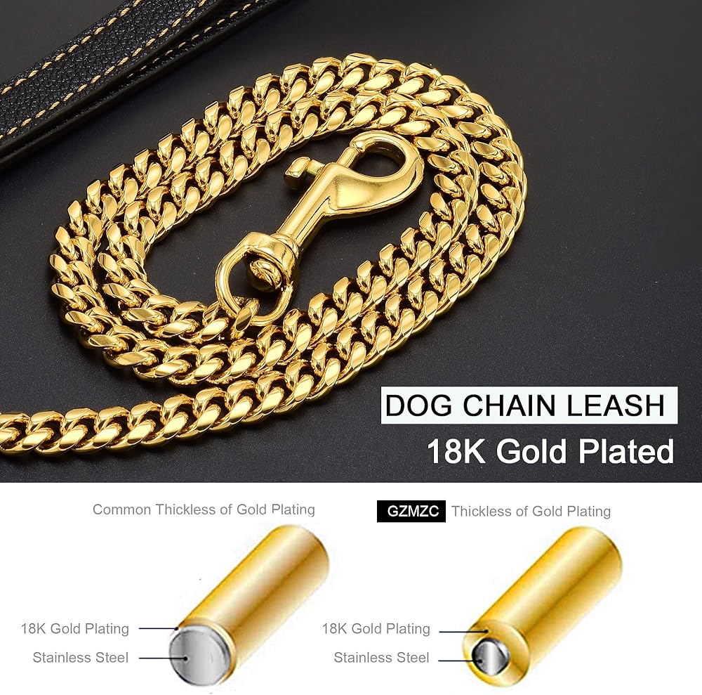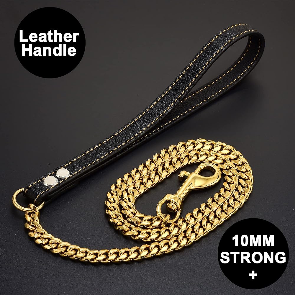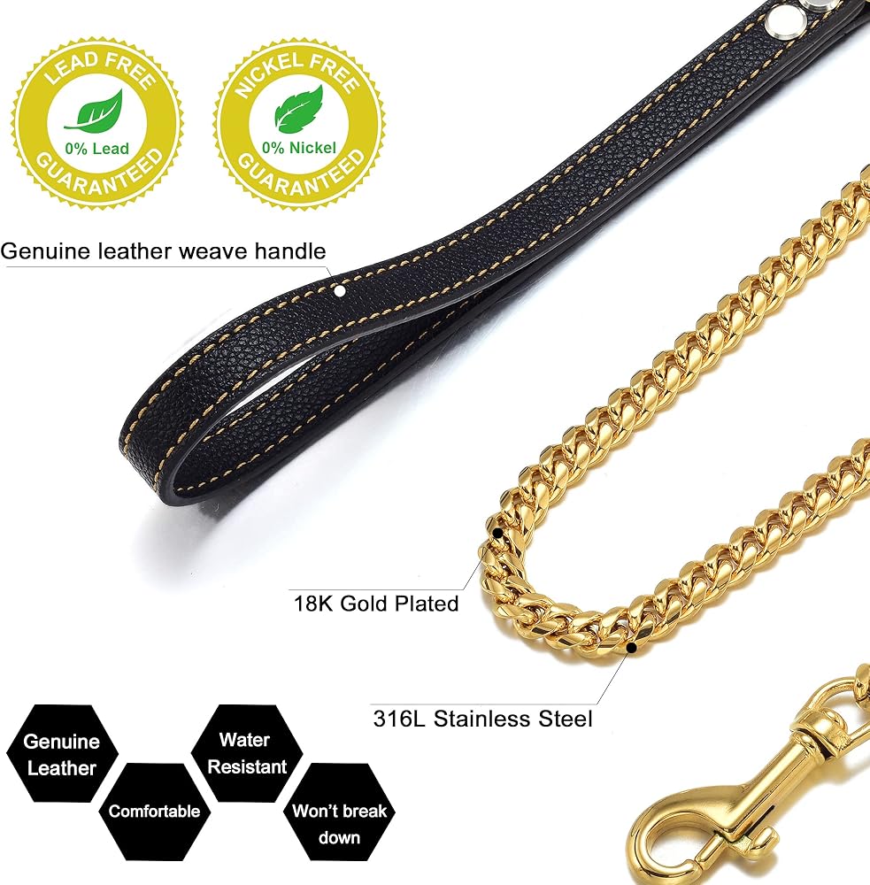 • What's this Dog Leash made of?: It's 18K gold plated over 316L stainless steel Cuban link chain with genuine leather handle. Miami Cuban link Chain is high strength and hardness, heavy, durable, no rust, or tarnish, ensuring many years of use! It is easy to lock and unlock the clasp and is very strong so that it can't be pulled apart even with 700lbs of force!