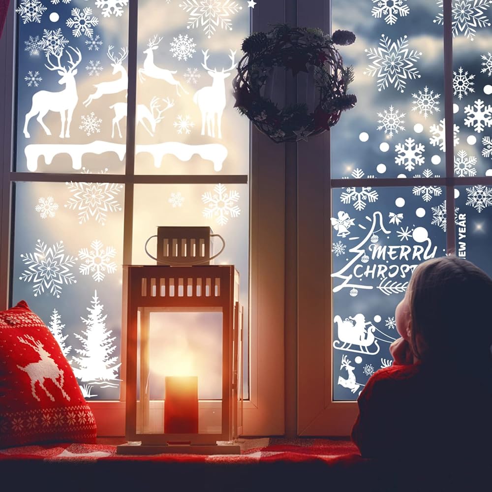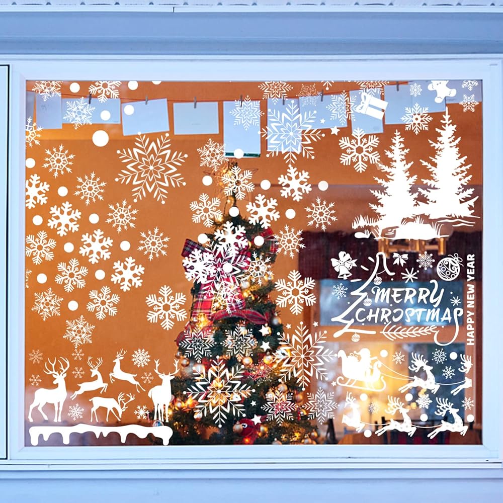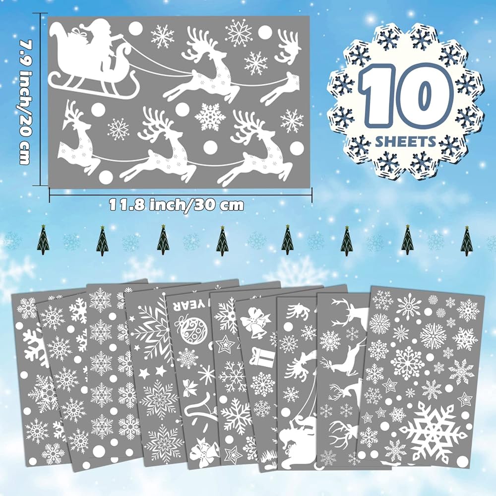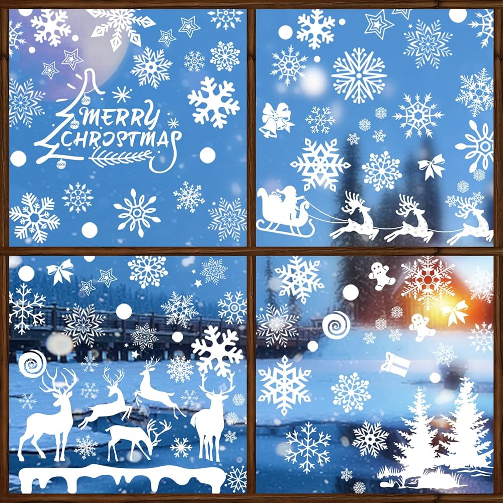 ملصقات نوافذ الكريسماس من OLIKER 260+ قطعة (10 ورقات)، ملصقات نوافذ عيد الميلاد البيضاء المرحة لعيد الميلاد المجيد، ملصقات النوافذ فروزن وينتر وندرلاند