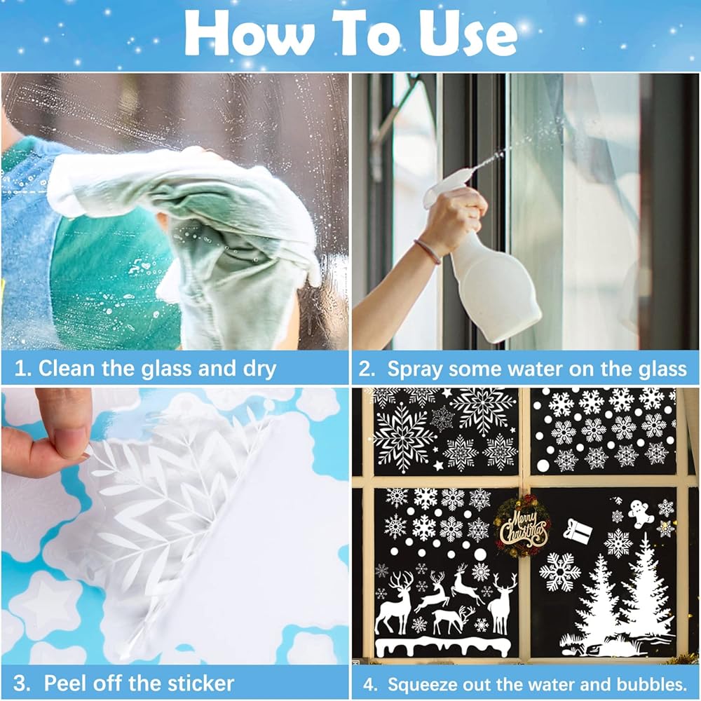❄قابلة لإعادة الاستخدام -- مناسبة تمامًا لأي سطح أملس، مثل الباب الزجاجي، النافذة، الثلاجة، إلخ. ملصقات نافذة عيد الميلاد قابلة لإعادة الاستخدام. يمكنك تقشير ملصقات النوافذ لتبقى جافة، وتخزينها في مكان بارد وجيد التهوية، حتى تتمكن من تخزينها للاستخدام في العام التالي، وسيدوم النمط واللون لفترة طويلة.