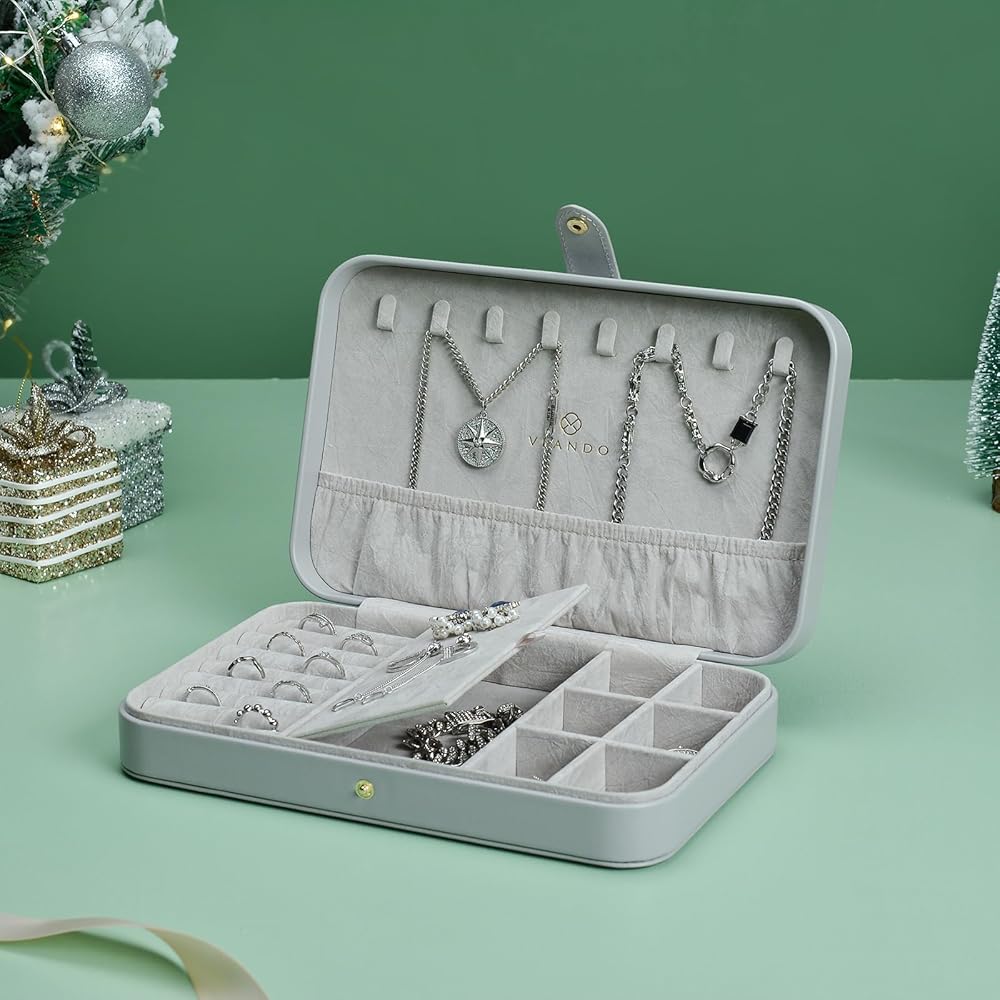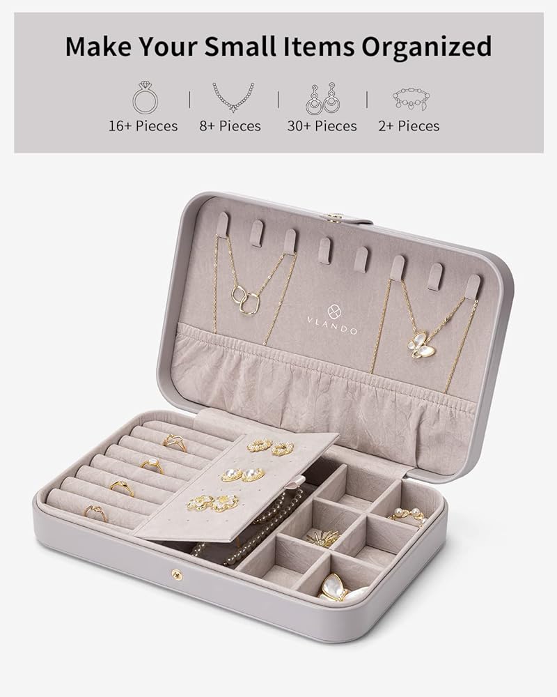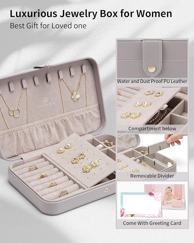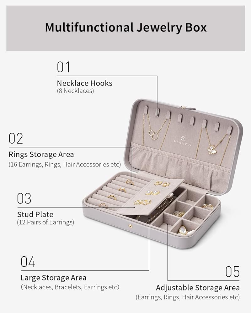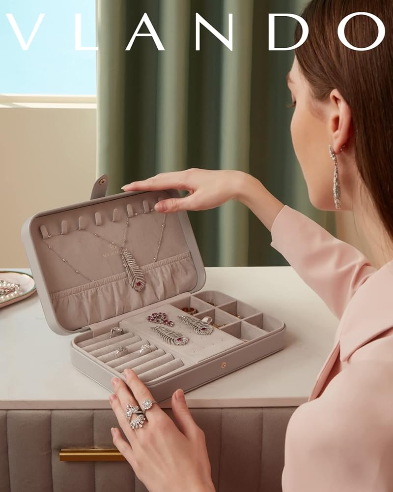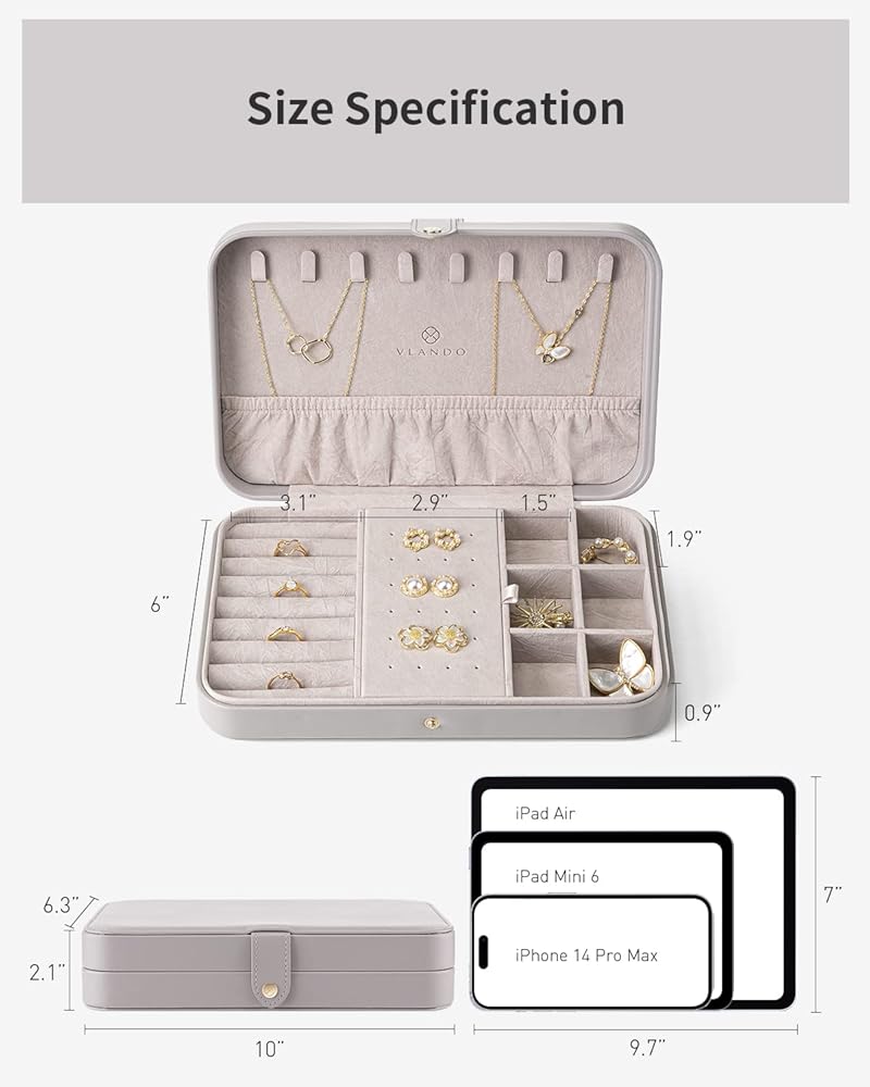 • تصميم كلاسيكي وخفيف الوزن - الأبعاد الإجمالية لحقيبة تخزين المجوهرات: 10X6.3X2.1 بوصة (الطول × العرض × الارتفاع)؛ الوزن: 1.06 مليار. يحتوي صندوق مجوهرات Vlando على مساحة تخزين كبيرة وتصميم معقول، لذلك يمكن تخزينه بسهولة في حقيبتك. ثلاثة خيارات ألوان لتمنحها للأصدقاء أو لنفسك. ستجلب حقيبة تنظيم المجوهرات الكثير من المفاجآت لك.