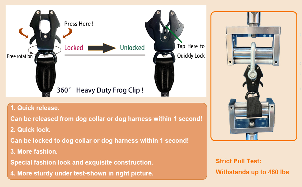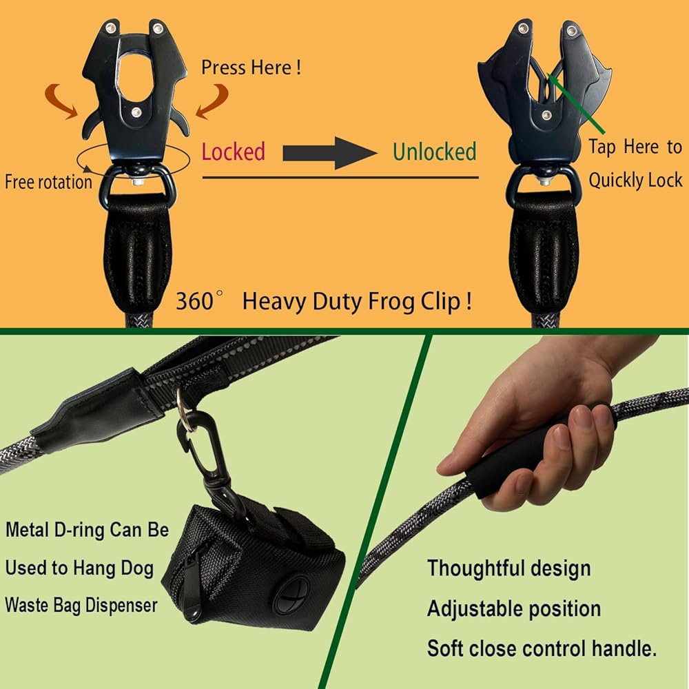 【مشبك ضفدع سريع الفك】مصمم بمشبك ضفدع دوار 360 درجة. في حالة الجر القوي، لا يزال من الممكن تحرير مشبك المقود الخاص بنا أو قفله بسرعة. يمكن تدويرها 360 درجة لمنع مقود الكلب من العقد والالتواء.