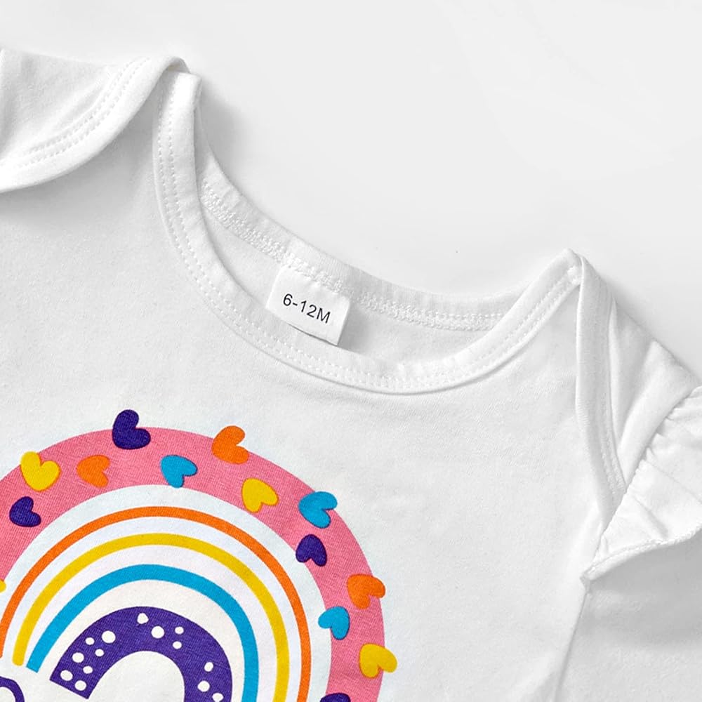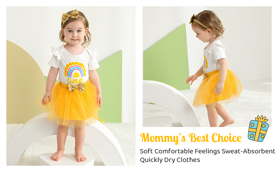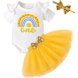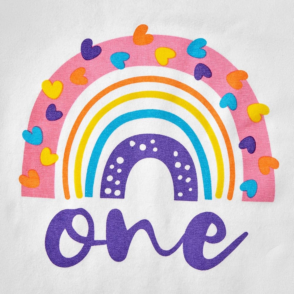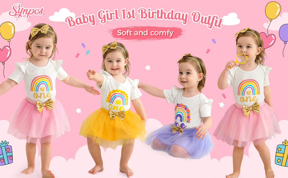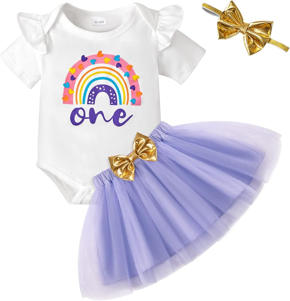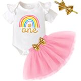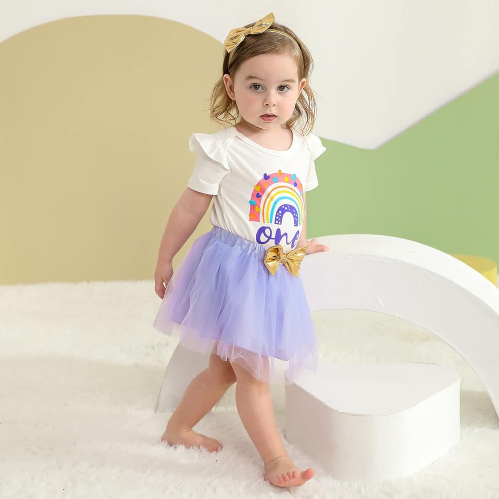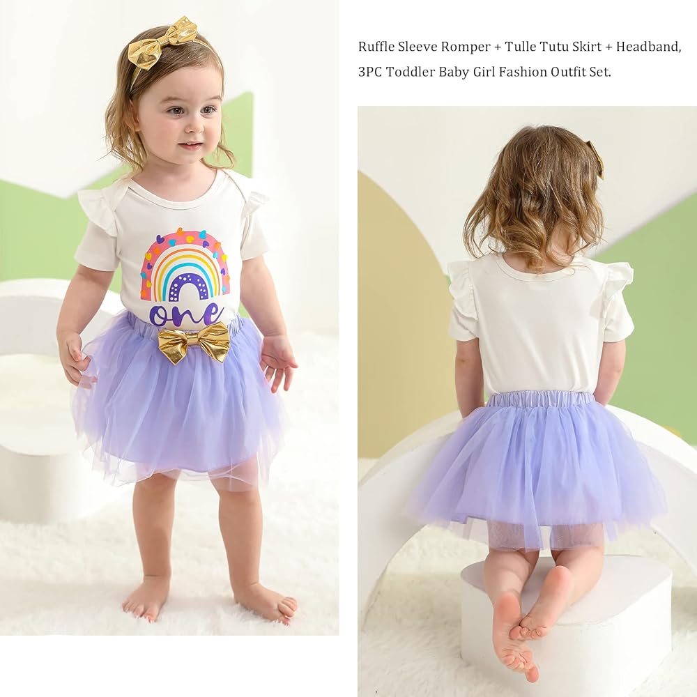 💜العبوة: 1x رومبر واحد للفتيات الصغيرات + 1x تنورة من التل لحديثي الولادة + 1x عصابة رأس. ملابس عيد ميلاد للفتيات الصغيرات بأكمام طويلة وطبعة قوس قزح + مجموعة ملابس الأميرة مع تنانير توتو مع عصابة رأس.