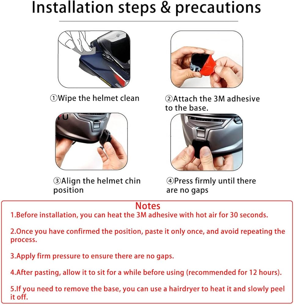 • طريقة التثبيت: تنظيف سطح الخوذة. ضع قاعدة الدعامة لتتوافق مع محيط الخوذة، ثم ضع اللاصق، واضغط بقوة لإزالة الفجوات. اتركه دون إزعاج لمدة 12 ساعة حتى يلتصق لاصق 3M بالكامل. قم بتأمين الوصلات المتحركة باستخدام البراغي، ثم أدخلها في القاعدة للتثبيت الكامل.