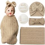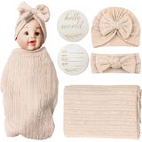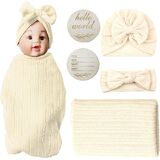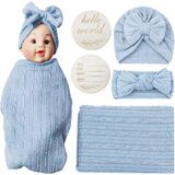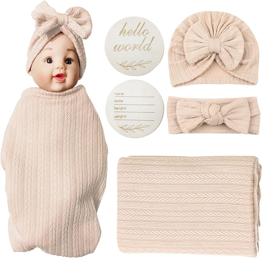 Newborn Swaddle Set with Matching Hat and Headband Bow,Wooden Birth Announcement Card,Muslin Baby Swaddle Blankets for Boys & Girls
