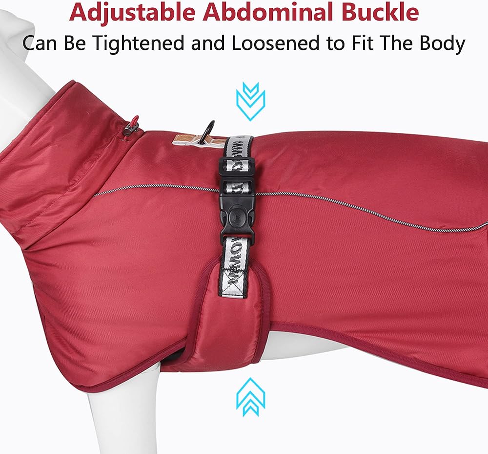 【4 أجزاء قابلة للتعديل】الأقسام الأربعة القابلة للتعديل موجودة على الياقة والصدر وحاشية سترة الكلب الكبيرة. الجزء الأمامي من الياقة مصنوع من مادة مرنة، والجزء الخلفي به رباط لضمان الدفء ولا يخنق الرقبة، ويمكن استرخاء مشبك الصدر أو تشديده. يمكن وضع شريط مطاطي عند الحاشية في رجلي الكلب الخلفيتين للحصول على ملاءمة ودفء أفضل.