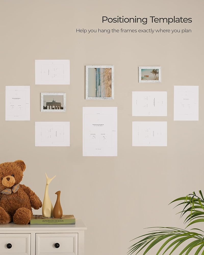 [سهلة تغيير الصور] أقراص دوارة متينة في الجزء الخلفي من كل إطار تسمح لك بتغيير صورك بسهولة. تتضمن مجموعة إطارات الصور هذه 10 قوالب لتحديد المواقع تساعدك على تعليق الإطارات في المكان الذي تخطط له بالضبط.