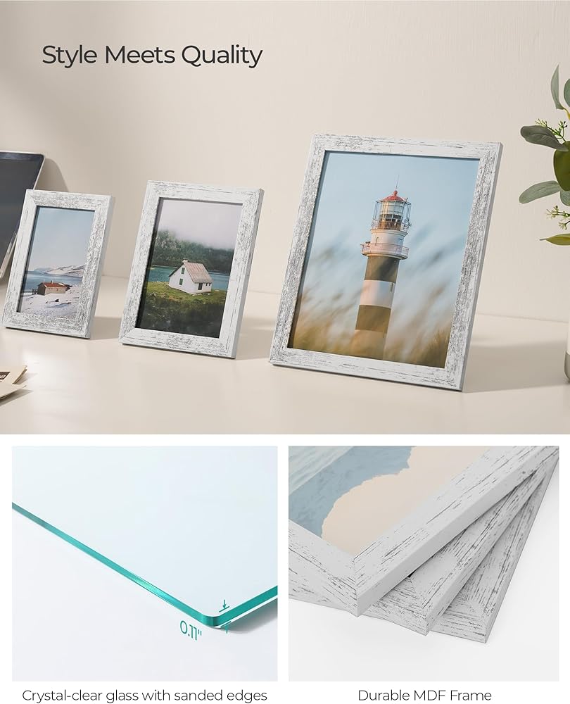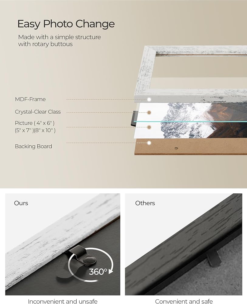 [زجاج متين ومضاد للخدش] مصنوع من خشب ليفي متوسط الكثافة عالي الجودة، ويمنحك ملمسًا ناعمًا ورقيقًا مع ملمس شفاف. إطارات الصور ذات اللون البني الريفي مع واجهة زجاجية شفافة لا تحافظ فقط على الحواف المصقولة وتمنع الخدوش عند تغيير الصور، ولكنها أيضًا تحافظ على الغبار بعيد.