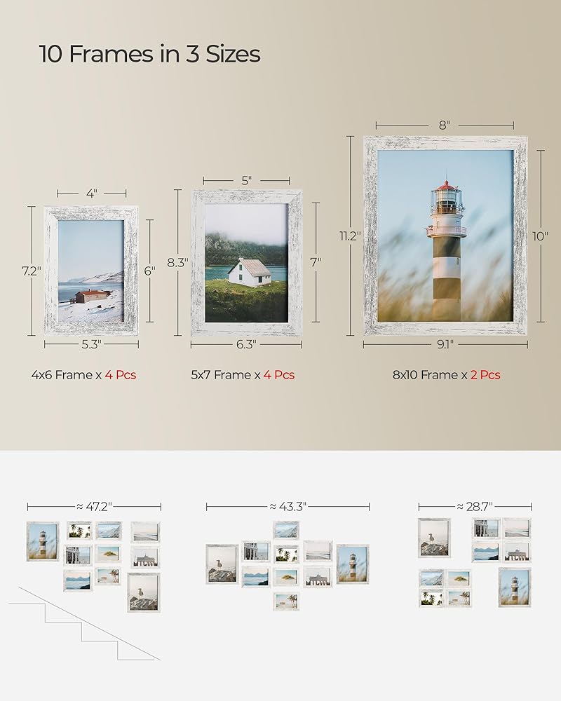 [عرض مخصص] يشتمل إطار الصور المجمعة هذا المكون من 10 عبوات على أربعة إطارات صور مقاس 4x6 بوصة، وأربعة إطارات صور مقاس 5x7 بوصة، وإطارين صور مقاس 8x10 بوصة. نحن نقدم 5 خيارات ألوان تكمل أي ديكور حائط وتلتقط ذكرياتك الجميلة.