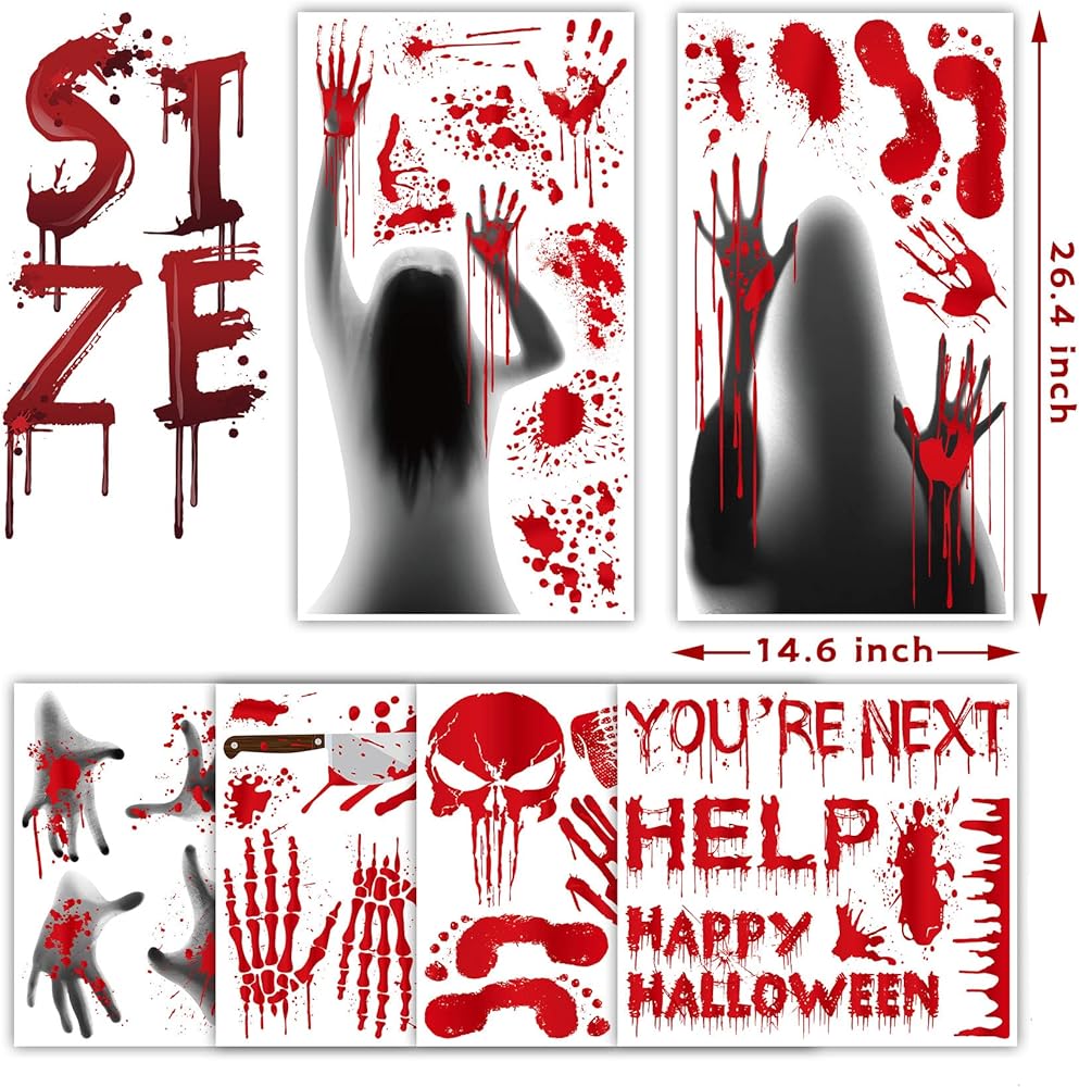 【نصائح مهمة لملصقات نوافذ الهالوين المخيفة】نافذة ديكورات الهالوين مكونة من 6 أوراق، وملصقات النوافذ المخيفة تتضمن "مساعدة الولايات المتحدة"، و"مساعدة"، و"أنت التالي"، وبصمة يد دموية، وبصمة القدم وبقع الدم. حجم بصمة اليد الدموية وبصمة القدم على الأرض يمكن مقارنته بحجم الشخص الحقيقي. تبدو ملصقات نافذة الهالوين على الوجهين بنفس الشكل من النافذة الداخلية والخارجية.