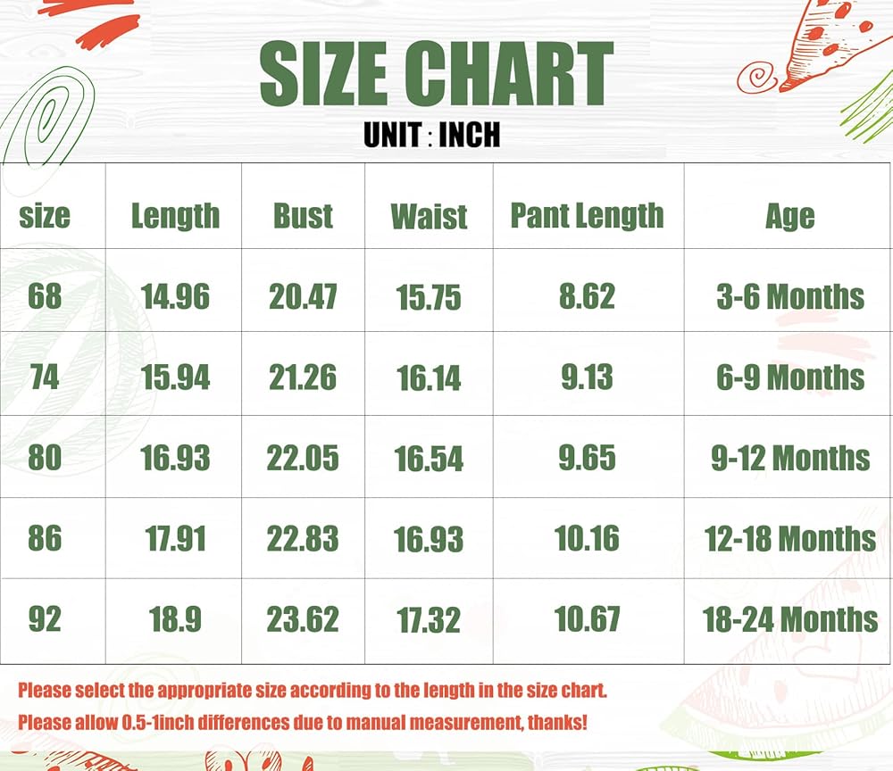 المقاس المناسب: مجموعات الأطفال الصغار من 0 إلى 3 أشهر، ملابس الفتيات الصغيرات من 6 إلى 9 أشهر، ملابس الفتيات الصغيرات من 9 إلى 12 شهرًا، ملابس عيد الميلاد الأول من 12 إلى 18 شهرًا، ملابس أطفال صيفية من 18 إلى 24 شهرًا. يرجى الطلب قبل التحقق من جدول المقاسات.
