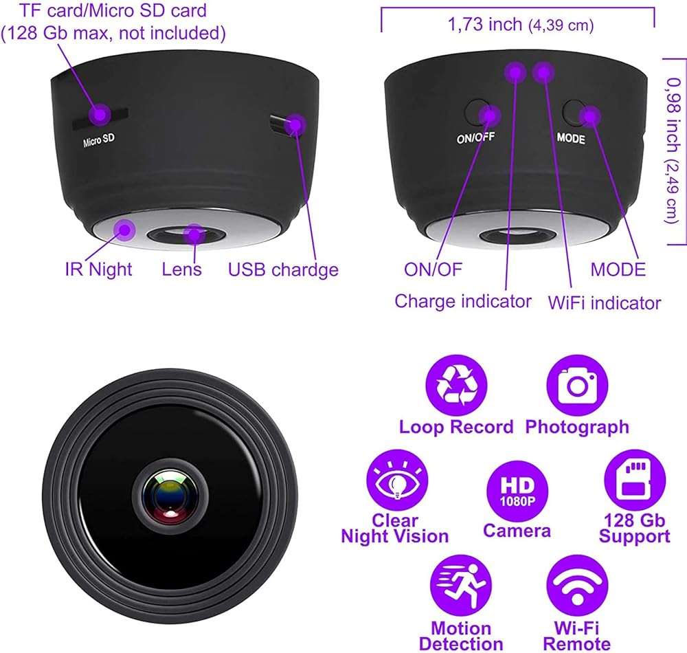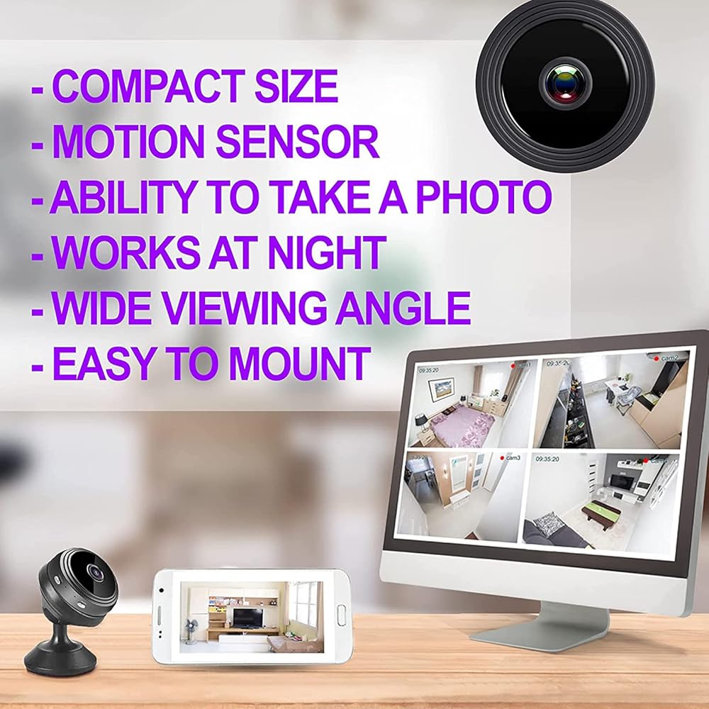 This mini WiFi camera features nightshot that provides 1080P image in the dark environments and wide viewing angle for more details.