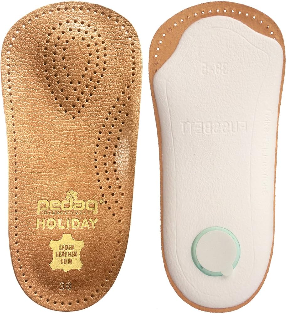 Save a little with these 2 pair packs. Holiday is Pedag's classic 34 length arch support with a semi-rigid longitudinal arch and plantar vault support, metatarsal pad and heel cushion. In women's sizes, Holiday is very slightly wider than Pedag's newest 34 orthotic named Viva Mini. Holiday is also slightly less rigid than Viva Mini. Holiday is particularly well suited for use in comfort, athletic and outdoor shoes and boots. Like Viva Mini, Holiday's surface is durable, breathable vegetable tanned leather. Holiday is very low profile (thin) and will fit into almost all shoes or boots. Holiday is ideal for shoes or boots without much toe room andor open toes. Holiday supports the plantar vault and helps prevent and relieve plantar fasciitis, over-pronation alignment issues. Holiday's metatarsal pad lifts and gently reforms the metatarsal arch which helps prevent and reduce symptoms of metatarsalgia, Morton's Neuroma, etc. Finally, Holidays heel cushion absorbs shock on the foot, ankle, knees and spine. Holiday has been awarded the American Podiatric Medical Association (APMA) Seal of Acceptance for promoting foot health.