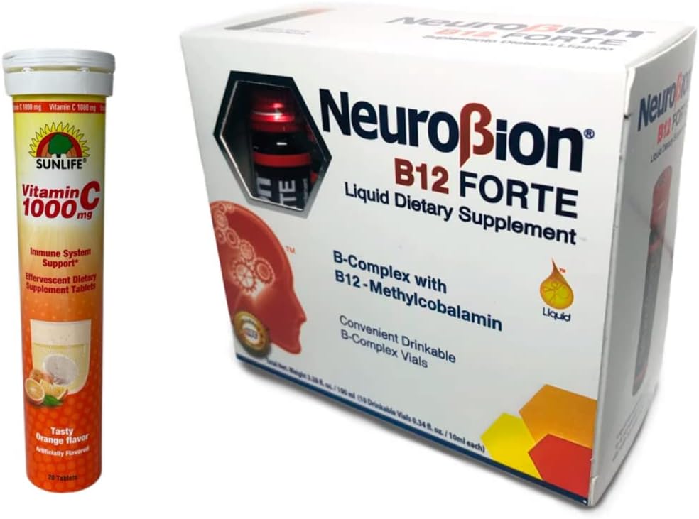 Neurobion B12 Forte Liquid Dietary Supplement with 10 drinkable vials of 10 ml each. Convenient Drinkable B-Complex Vials with 3000 mcg of B-12 - Methylcobalamin. + Sunlife Vitamin C supports the body in cases of excessive strain. Especially working people, adolescents, sports people, pregnant and lactating women, the elderly, and smokers should ensure that their vitamin C intake is sufficient.