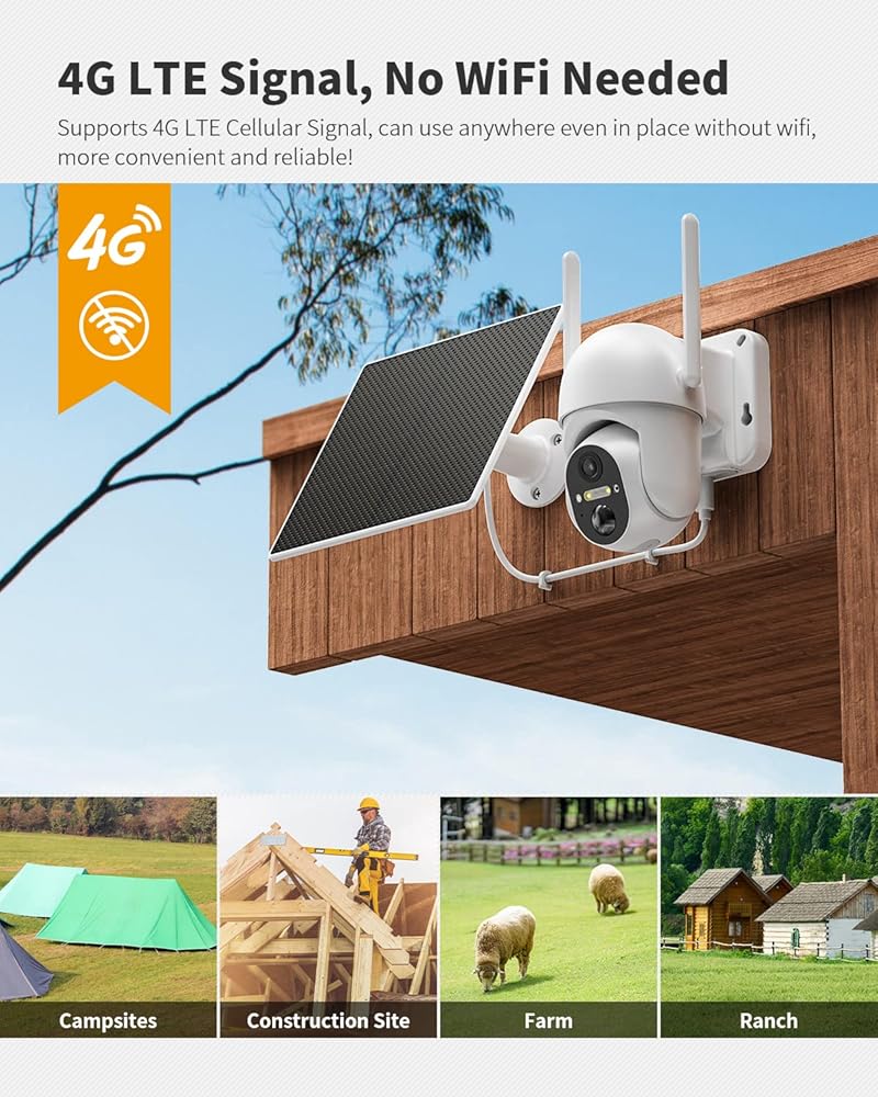 【مثالية للأماكن التي لا تحتوي على واي فاي وطاقة كهربائية】تعد كاميرا الأمان الخلوية 4G LTE مثالية للمراقبة عن بعد في الأماكن التي لا تحتوي على واي فاي أو طاقة كهربائية، مثل المزارع والمزرعة والكبائن والمناطق البرية. إنه خالي من الأسلاك بنسبة 100% ومقاوم للطقس مع تصنيف IP65.