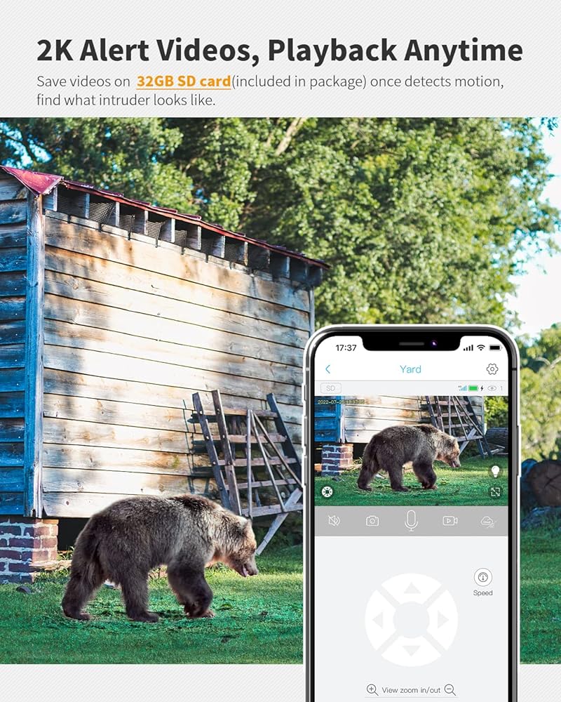 【تنشيط الحركة والتشغيل على الهاتف الذكي】مستشعر حركة PIR المتقدم يقلل من الإنذارات الكاذبة. احصل على تنبيهات في الوقت الفعلي على هاتفك عند اكتشاف الحركة على كاميرا الأمان هذه التي لا تعمل بتقنية wifi. يتم حفظ مقاطع الفيديو واللقطات المكتشفة للحركة محليًا على بطاقة SD صغيرة أو يتم نسخها احتياطيًا على السحابة لتشغيلها بسهولة في أي وقت.