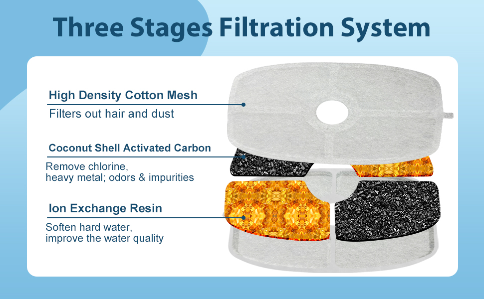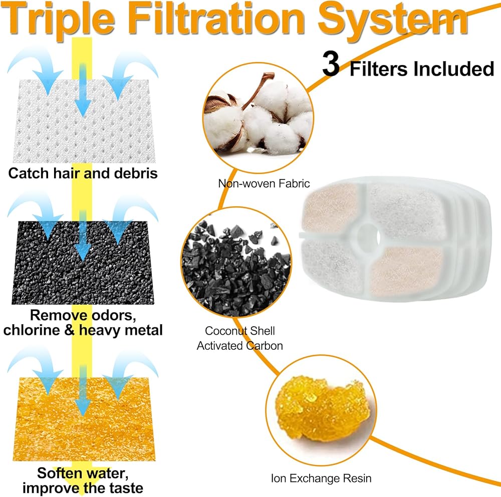 【تصفية ثلاثية المراحل】 مرشحات نافورة مياه الحيوانات الأليفة مصنوعة من قماش غير منسوج، والكربون المنشط بغلاف جوز الهند وراتنج التبادل الأيوني. لا يمكنها تصفية الشعر والشوائب فحسب، بل يمكنها أيضًا إزالة الروائح الكريهة والمعادن الثقيلة وتنعيم المياه وتحسين الطعم. الترشيح الثلاثي يمكن أن يحافظ على المياه طازجة ونقية، مما يمكن أن يمنع أمراض الكلى والمسالك البولية. اجعل حيواناتك الأليفة أكثر صحة