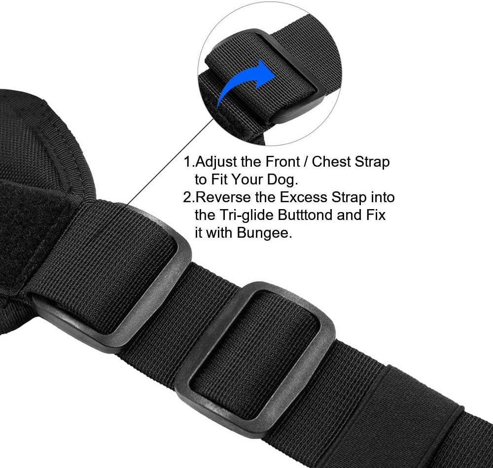 • سرج للكلاب قابل للتعديل - قم أولاً بضبط حزام الصدر الأمامي ليناسب كلبك. أخيرًا، قم بعكس الحزام الزائد في زر الانزلاق الثلاثي وثبته بحبل مطاطي، حتى لا يكون من السهل فك حزام الكلب.