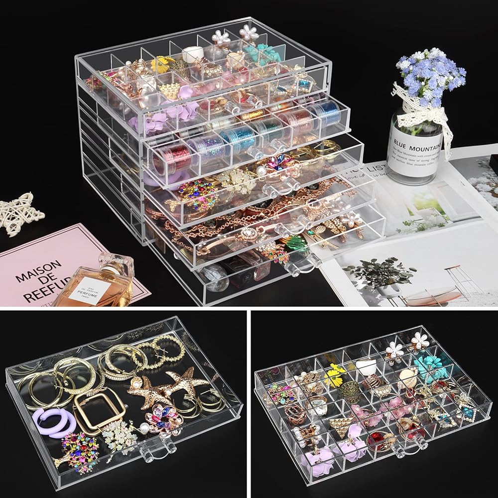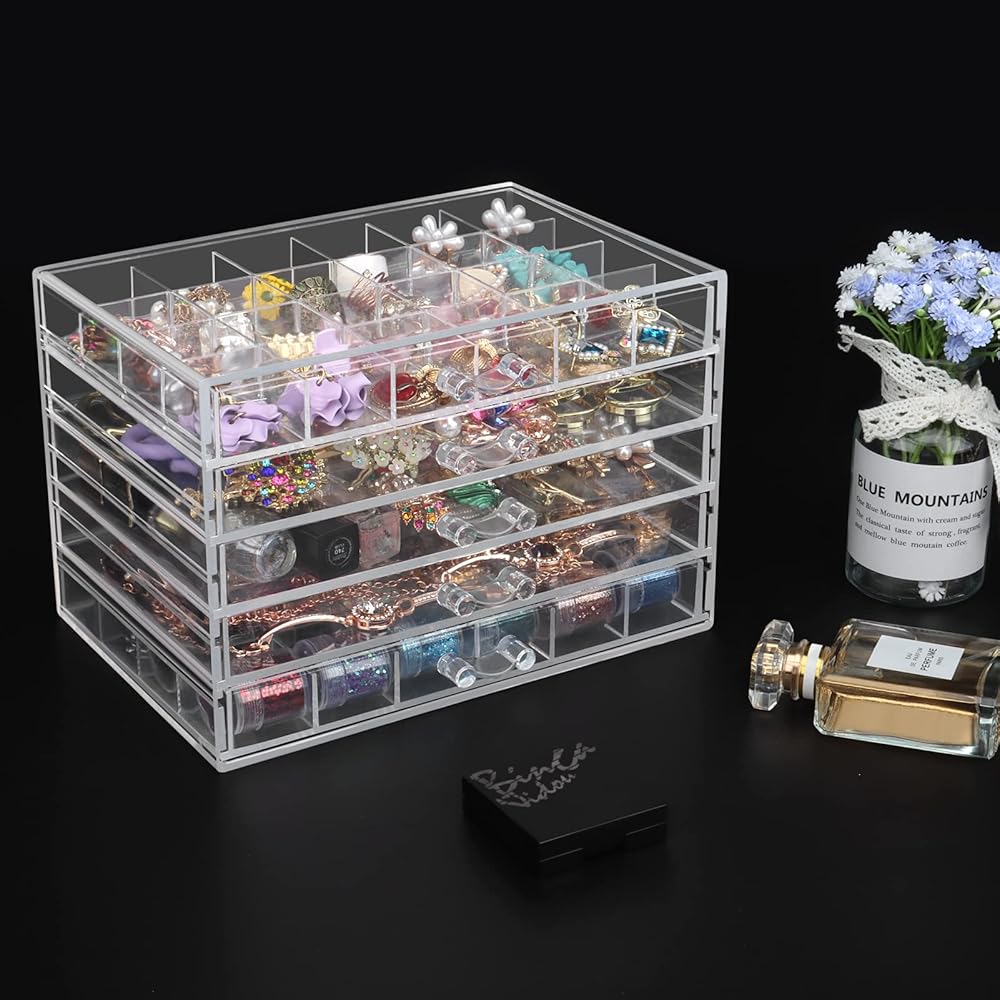 منظم مجوهرات ديزاينستر أكريليك 5 أدراج صندوق مجوهرات أكريليك شفاف للنساء صندوق تخزين أقراط شفاف حامل عرض مجوهرات للحرف اليدوية حلى فن الأظافر - 5 طبقات