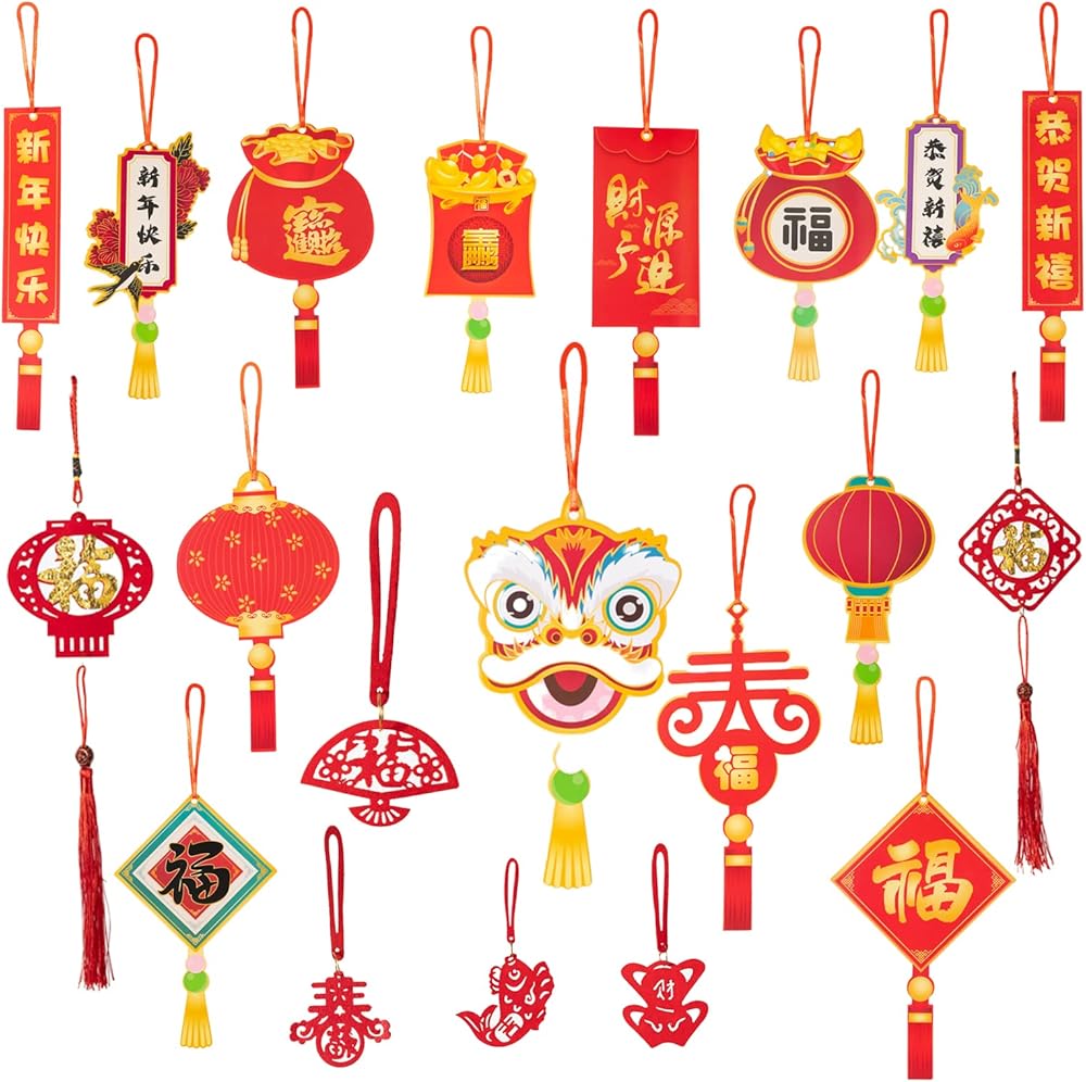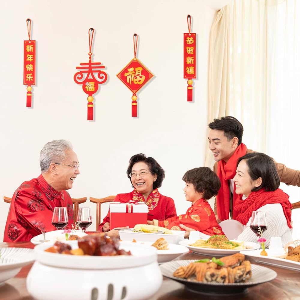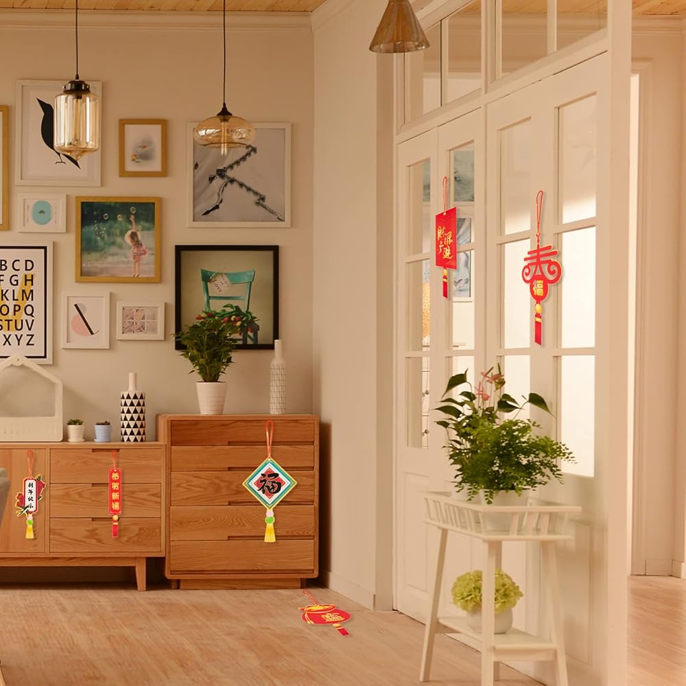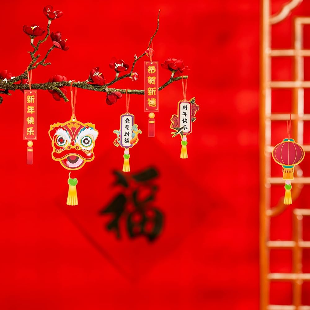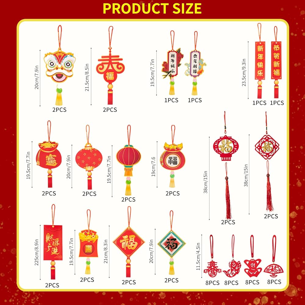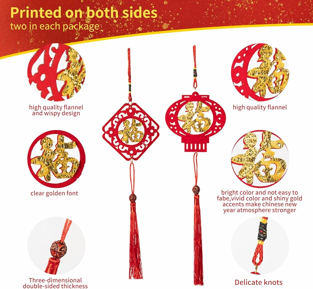 تصميم صيني تقليدي: تم تصميم هذه الديكورات المعلقة للسنة القمرية الصينية بأنماط صينية تقليدية بألوان حمراء وذهبية زاهية، وهذه الأنماط مثل السبائك الذهبية والفوانيس والأسماك وكلمات المباركة وما إلى ذلك مما يعني الصحة والسلام والحظ الجيد. ستساعدك منتجاتنا على خلق جو احتفالي قوي.