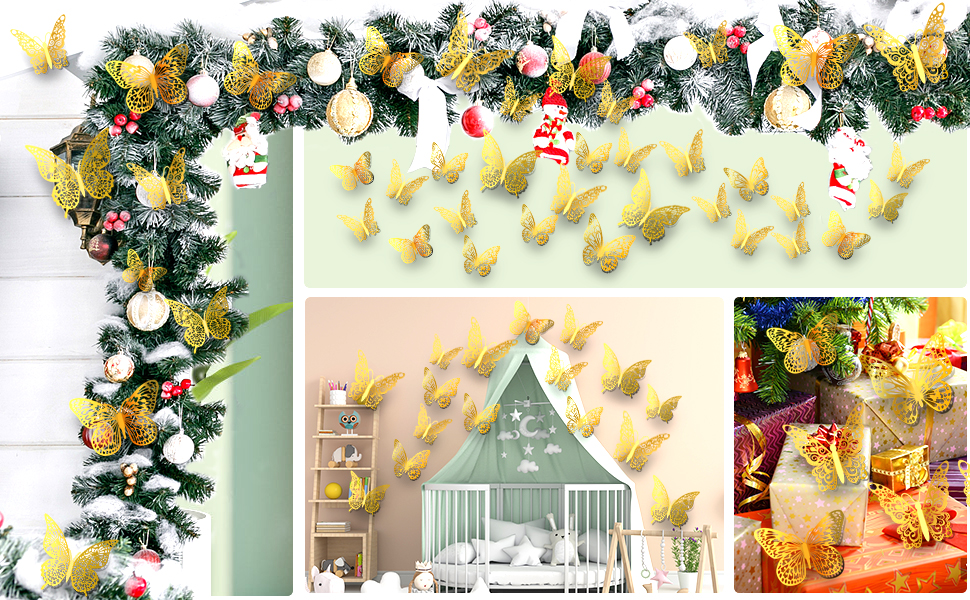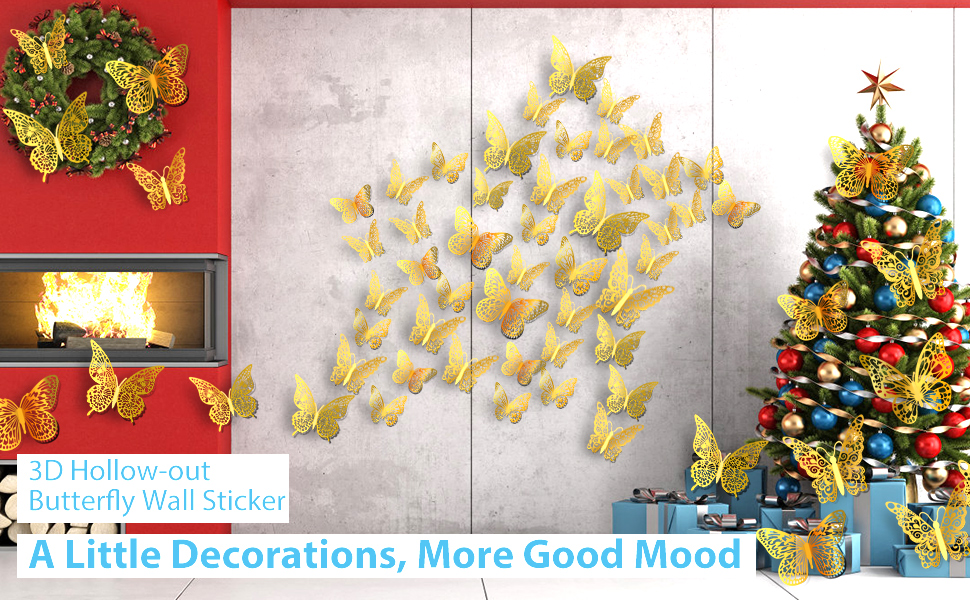 ديكور حائط حيوي: فراشاتنا مناسبة للحفلات ذات الطابع الخاص، وديكورات الكعك، واحتفالات العطلات، وديكورات عيد الميلاد؛ تزيين غرف النوم، وغرف المعيشة، والمكاتب، والمعارض، وحفلات أعياد الميلاد، وما إلى ذلك. تبدو مفعمة بالحيوية ومثيرة للاهتمام للغاية، ولها تأثير تجميل ممتاز، مما يضيف حيوية إلى مساحة المعيشة الخاصة بك ويثري المستوى الزخرفي.