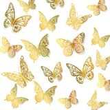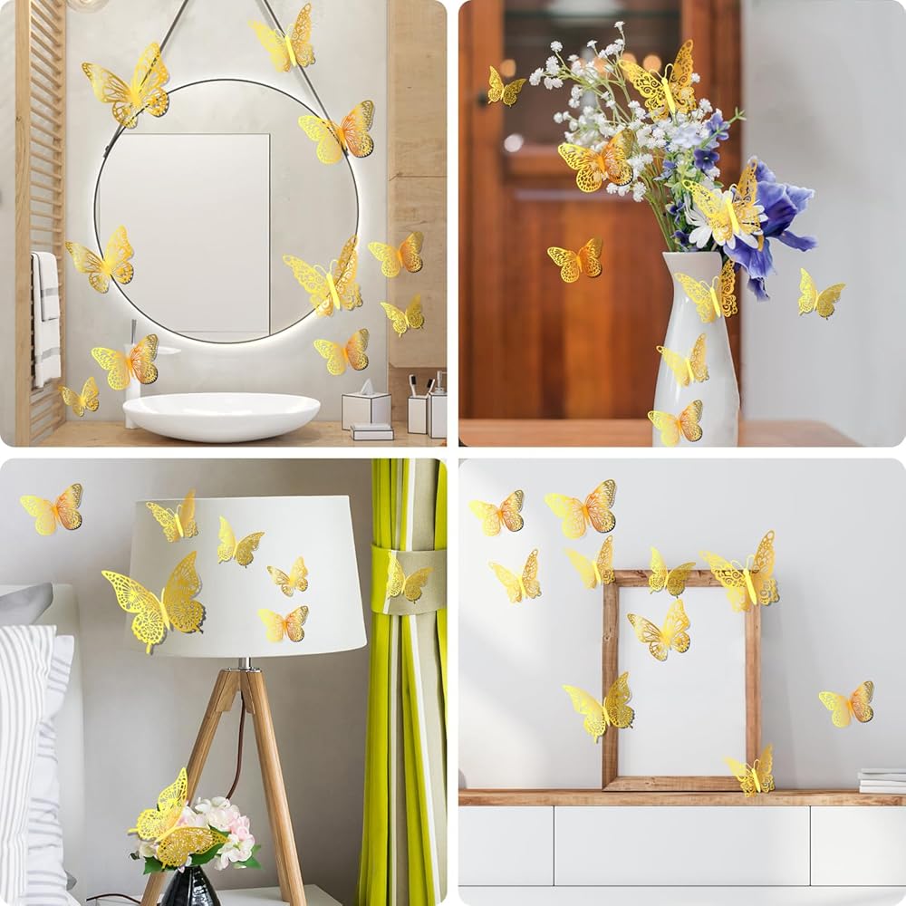 AbluFirst 3D 48PCS 3 حجم ملصقات جدار الفراشة، ديكور جدار الفراشة، ديكورات الفراشة لغرفة جدارية الشارات حزب كعكة الزفاف عيد ميلاد ديكور الفصول الدراسية غرفة نوم الطفل غرفة المعيشة (الذهب)