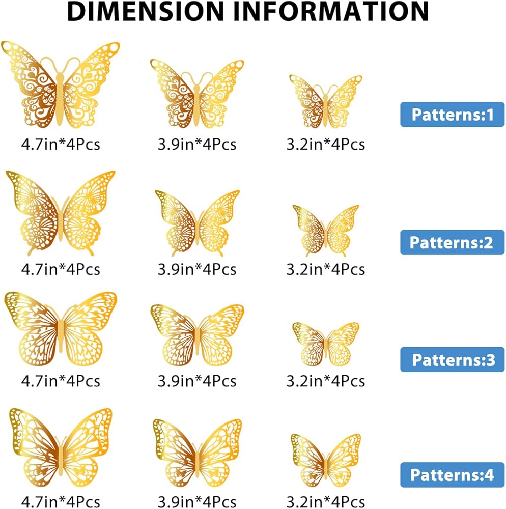 جرب ديكور الحائط الخاص بنا على شكل فراشة ثلاثي الأبعاد: سوف تحصل على 48 قطعة من ملصقات الحائط على شكل فراشة. 12 قطعة نمط 1، 12 قطعة نمط 2، 12 قطعة نمط 3 و12 قطعة نمط 4. كل نمط له 3 أحجام (4.7 بوصة، 3.9 بوصة، 3.1 بوصة). يأتي مع 48 قطعة من النقاط اللاصقة على الوجهين.