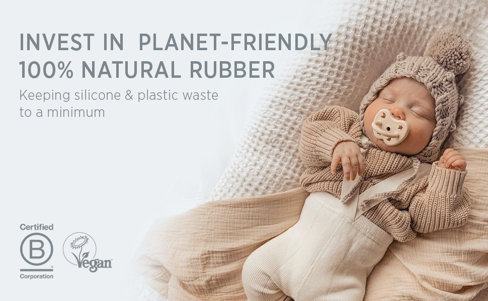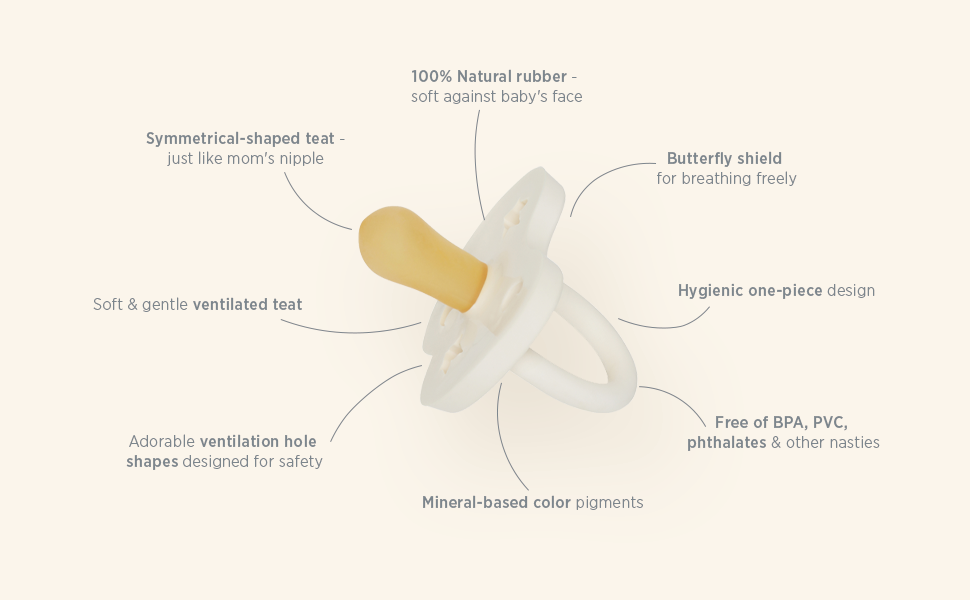 موثوقة من قبل الآباء لتكون طبيعية وآمنة لحديثي الولادة - مصنوعة من المطاط الطبيعي بنسبة 100%، لهايات هيفيا نباتية ومعتمدة نباتية، وبالتالي فهي خالية تمامًا من البيسفينول أ، وكلوريد متعدد الفينيل، والفثالات، والمواد الضارة الأخرى. بالإضافة إلى ذلك، فإن أصباغ الألوان لدينا طبيعية أيضًا