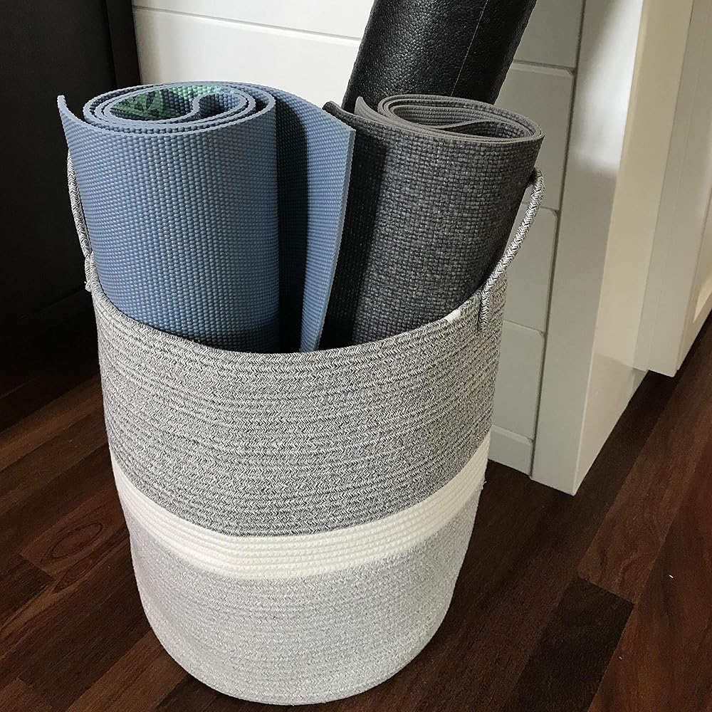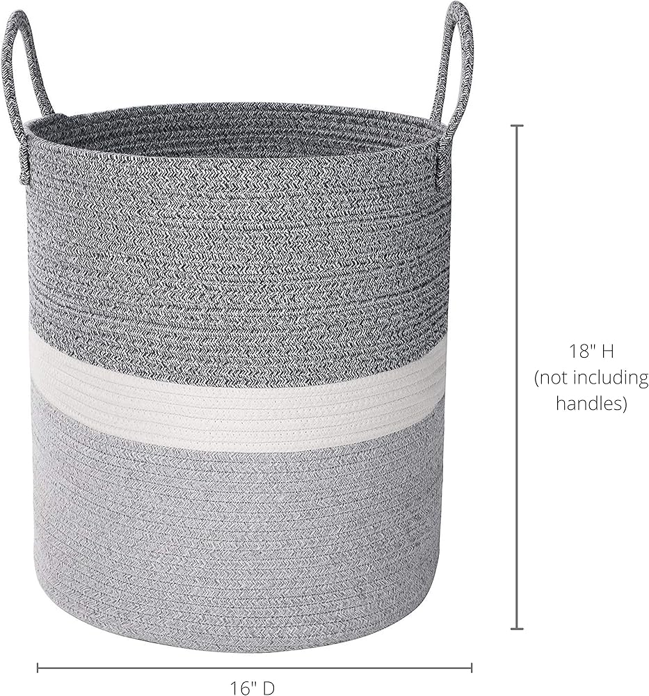 • الحجم الصحيح تمامًا: سلة السلة المنسوجة لدينا هي الحجم المثالي لتخزين ملابس الغسيل أو الأغطية أو حتى سجادات اليوجا ولفائف ورق التغليف. يُستخدم في غرفة المعيشة أو غرفة الغسيل كمنظم للتخزين. إنه الحجم المناسب للعديد من الأغراض. مقاس 16 بوصة عمق × 18 بوصة ارتفاع.