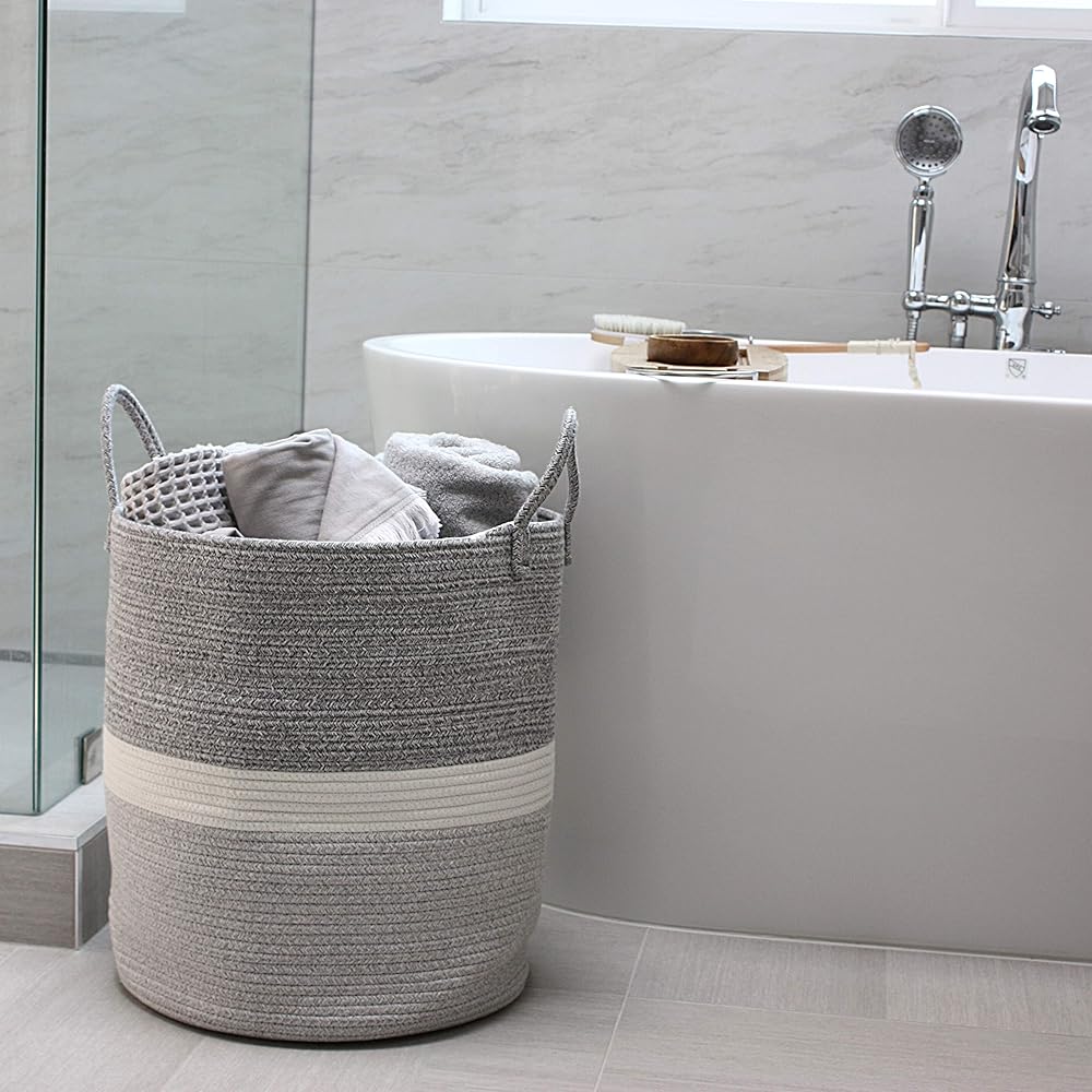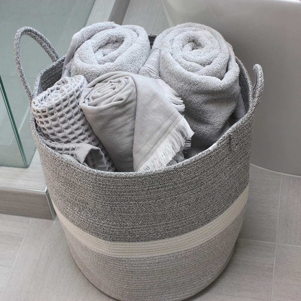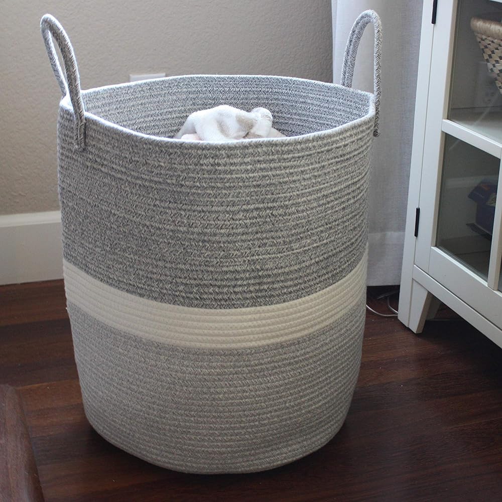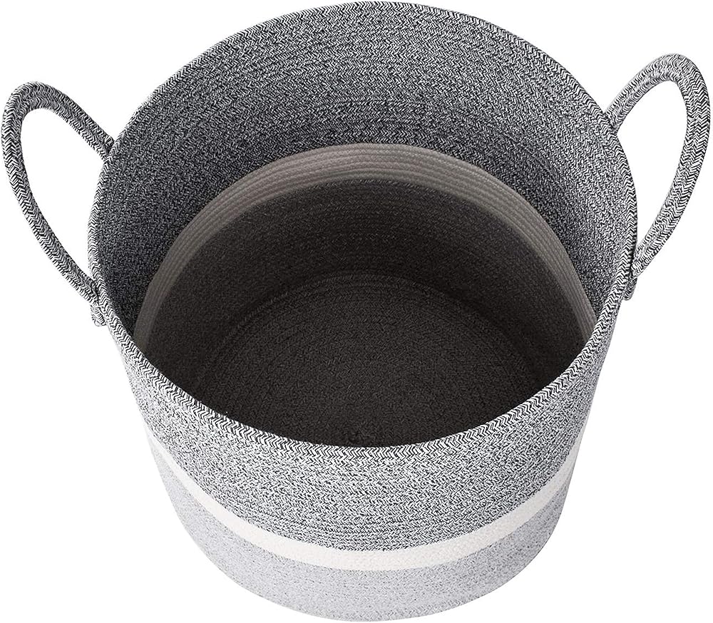 سلة بطانيات كبيرة جدًا لغرفة المعيشة - سلة منسوجة للتخزين - سلة حبال أنيقة للبطانيات - سلة ألعاب - رمادي/طبيعي - مستديرة 45.72 سم × 40.64 سم