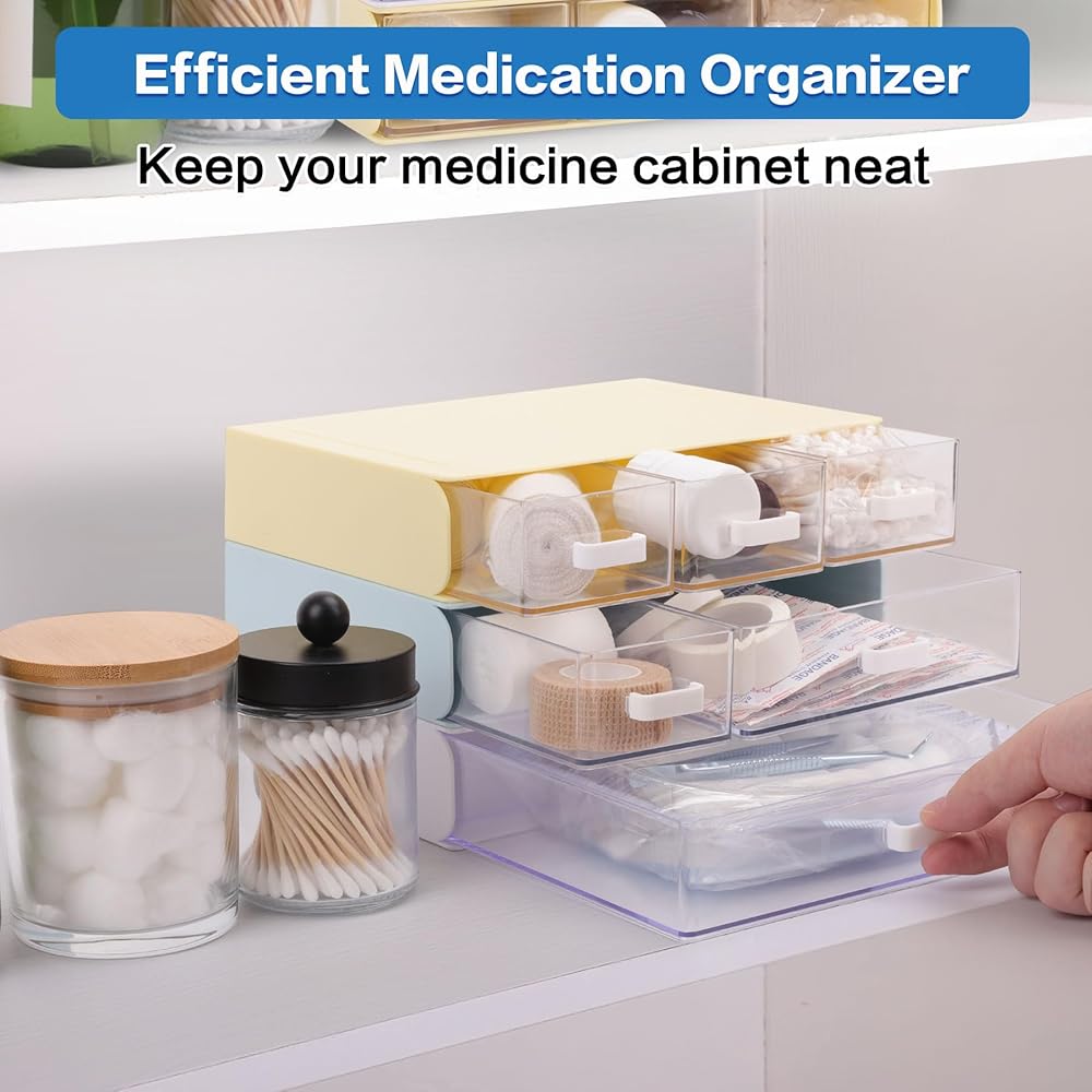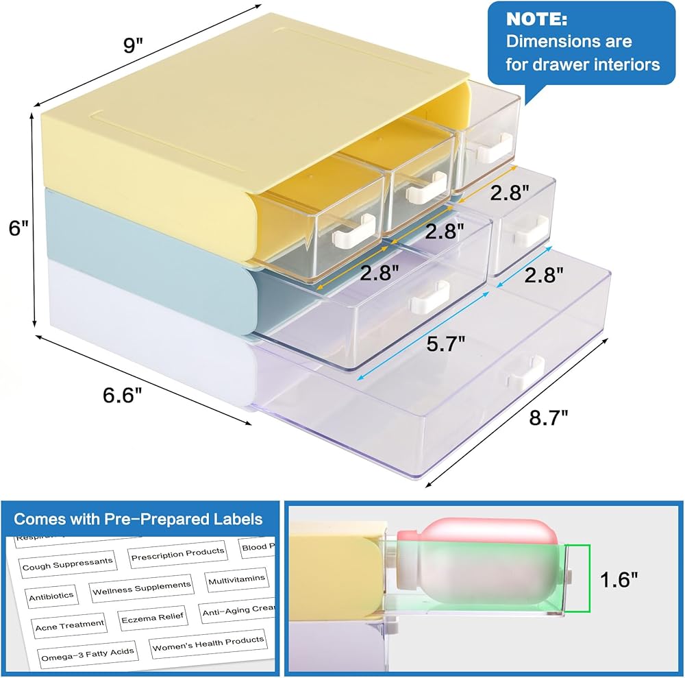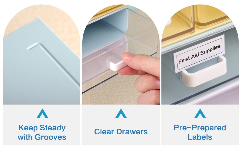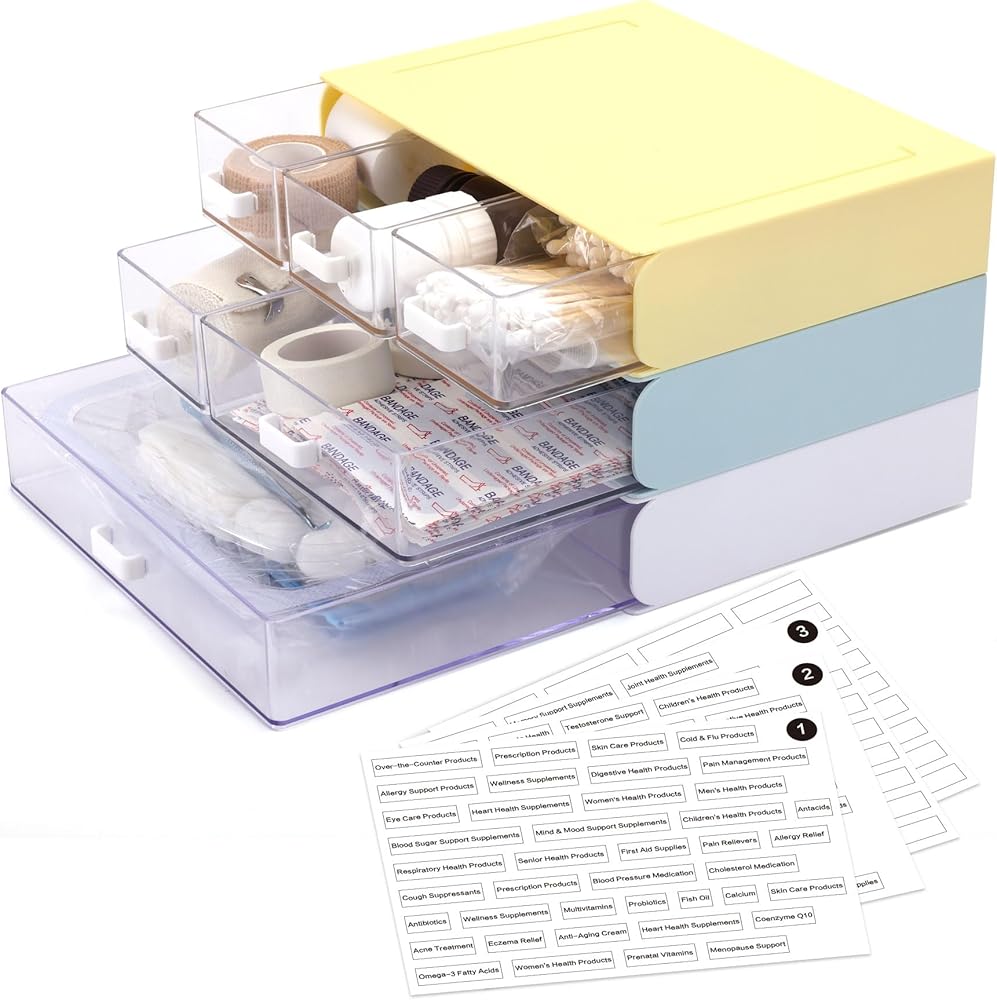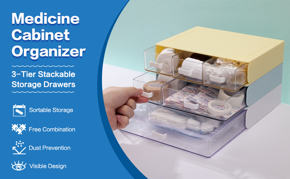 【Efficient Medication Organizer】Efficiently sort your first aid supplies and daily medications with this stackable 3-tier storage drawers. The clear, labeled drawers make finding what you need quick and easy. The stackable and modular design makes optimal use of your space in your medicine cabinet. The top and bottom interlocking grooves ensure stable stacking, preventing easy toppling.