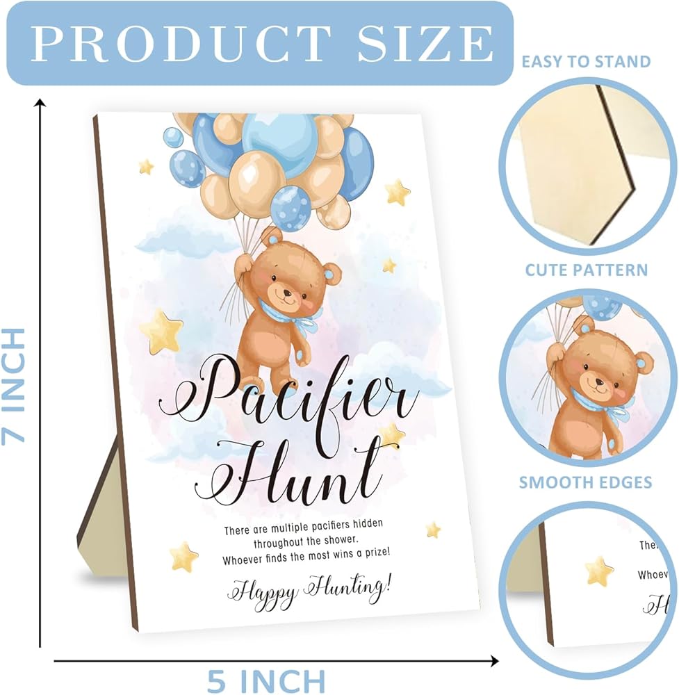 The centerpiece of this set is the meticulously designed 5x7 inch wooden sign, adding a touch of rustic elegance to your event. Accompanying the sign are 50 blue acrylic mini pacifiers, carefully crafted to mimic the charm of real pacifiers. These mini pacifiers not only serve as game props but can also be repurposed for versatile decor purposes.