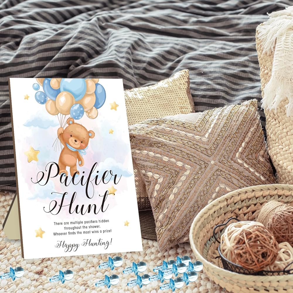 Elevate your baby shower experience with the Pacifier Hunt Baby Shower Game Set. This captivating game will have your guests excitedly searching for hidden blue acrylic mini pacifiers, creating laughter and memories to last a lifetime.