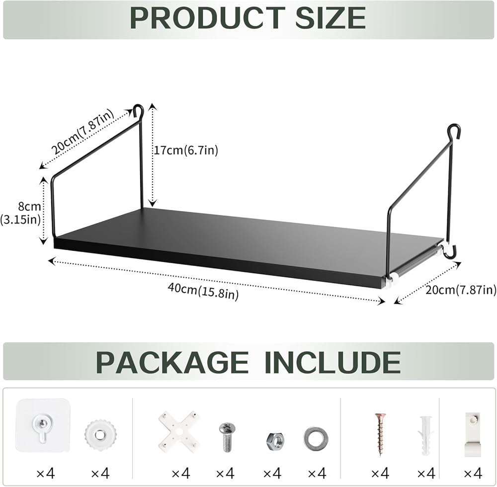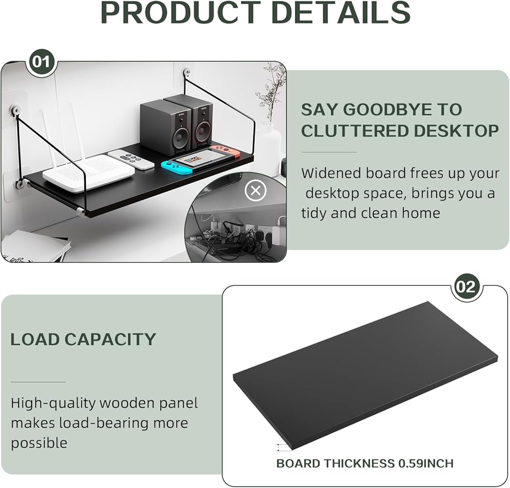 【اكتشف المزيد من المساحة】هل يزعجك المنزل الفوضوي؟ لماذا لا تجرب رف الترفيه العائم هذا الذي سيوفر لك مساحة تخزين وعرض واسعة مع لوحه الموسع (15.8 انش طول × 7.87 انش عرض × 0.6 انش ارتفاع). يمكنك وضع العديد من العناصر عليه مثل الراوتر ومكونات التلفزيون والكتب والنباتات والحرف اليدوية والصور ومنظف الغسيل وما إلى ذلك.
