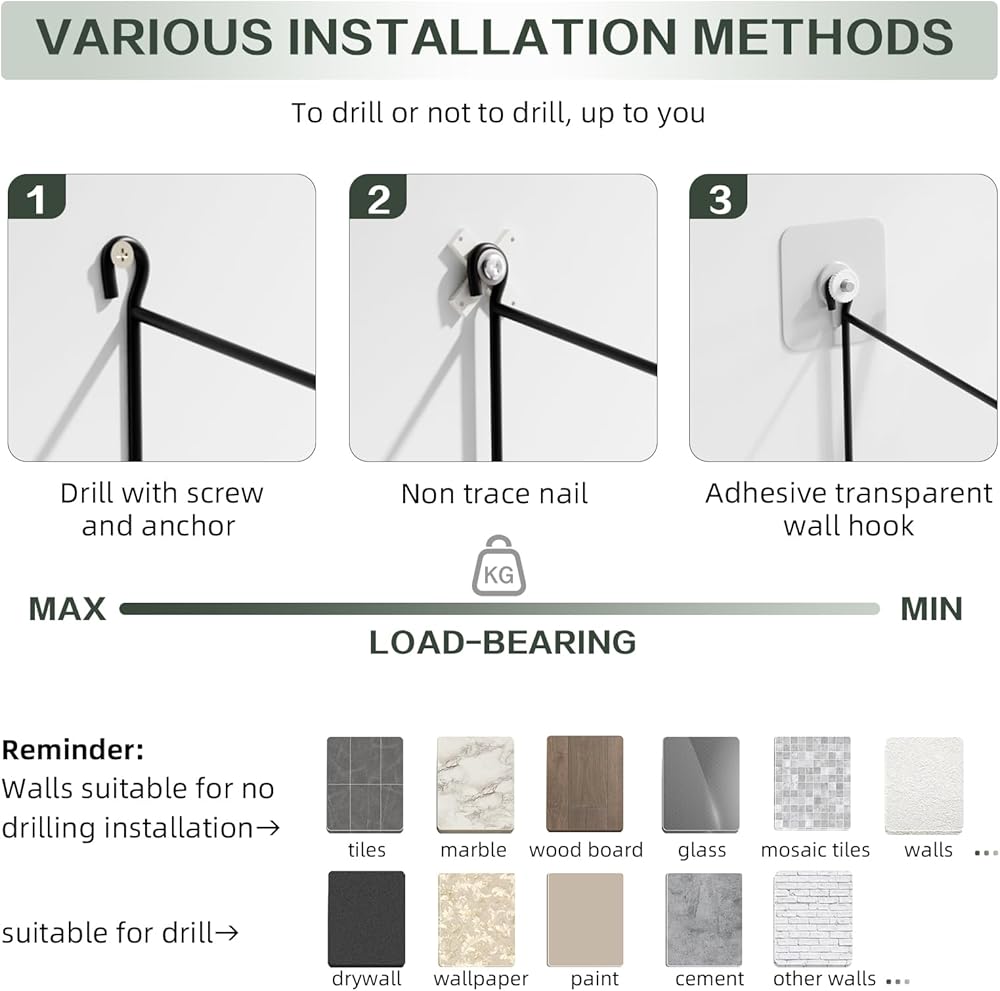 【3 طرق للتركيب】للثقب أو عدم الحفر، الأمر متروك لك. بالنسبة للجدران ذات الأسطح الملساء مثل البلاط والرخام والألواح الخشبية والزجاج التي يصعب سقوطها، يمكن تركيبها دون حفر (يمكن استخدام مسمار لا يترك أثرًا أو خطاف الحائط الشفاف). بالنسبة للجدران الجافة وورق الحائط والطلاء والأسمنت والجدران الأخرى، يمكنك اختيار الثقب والتركيب.