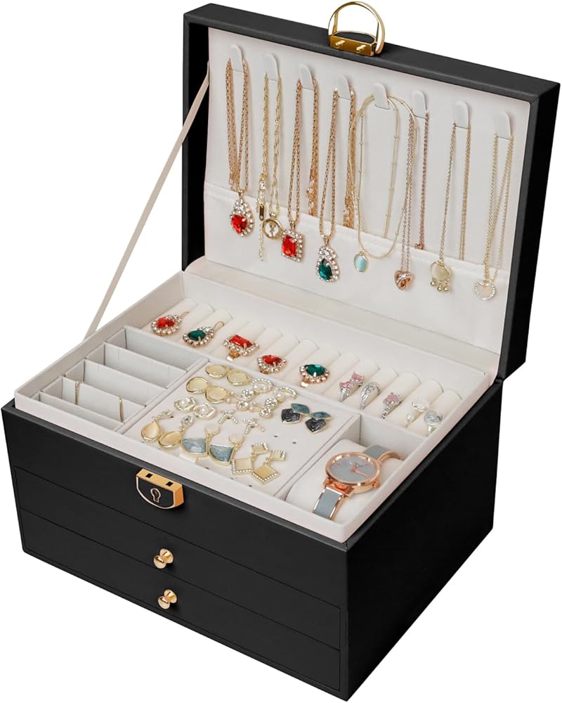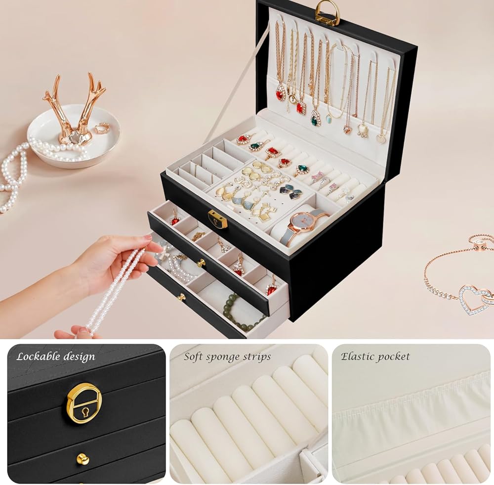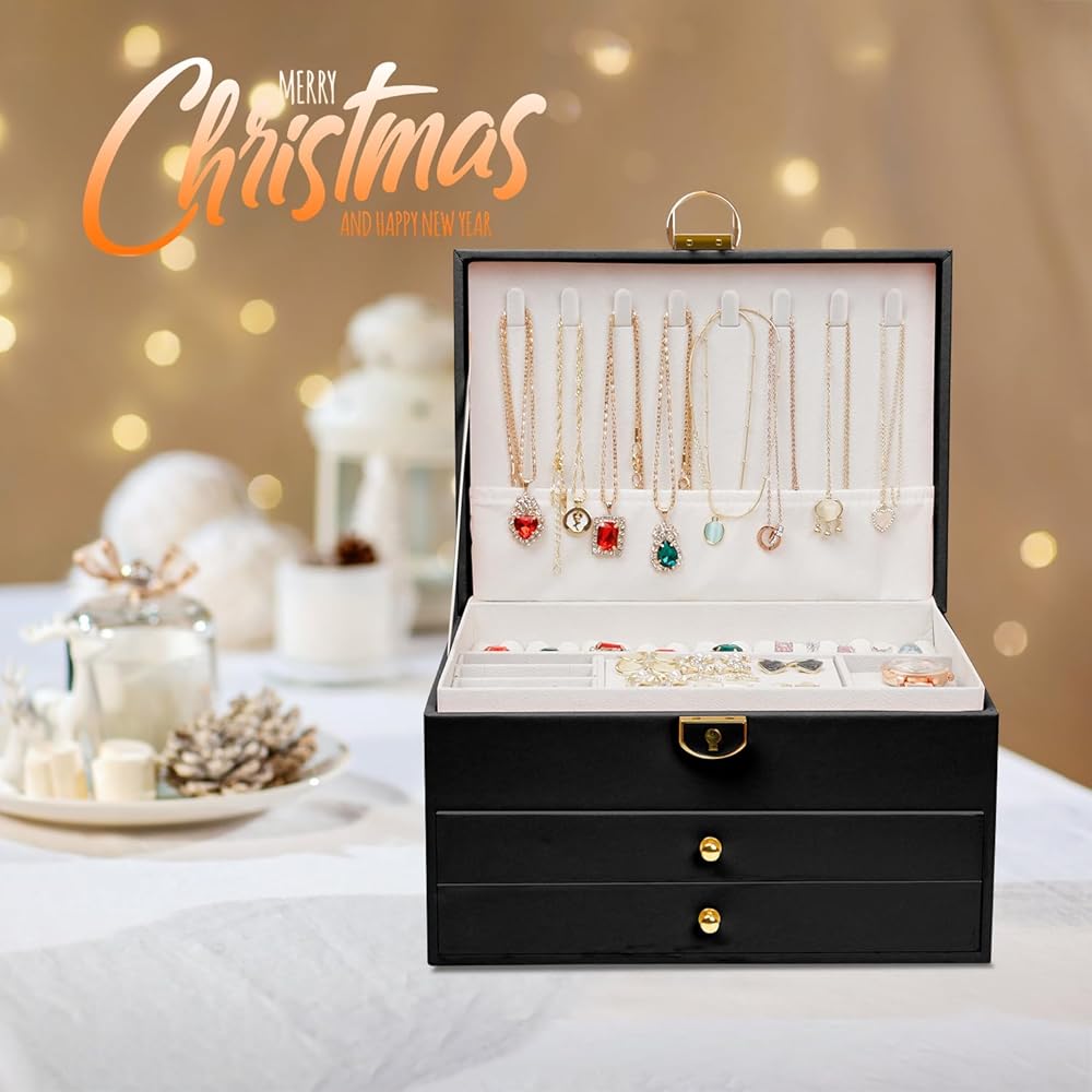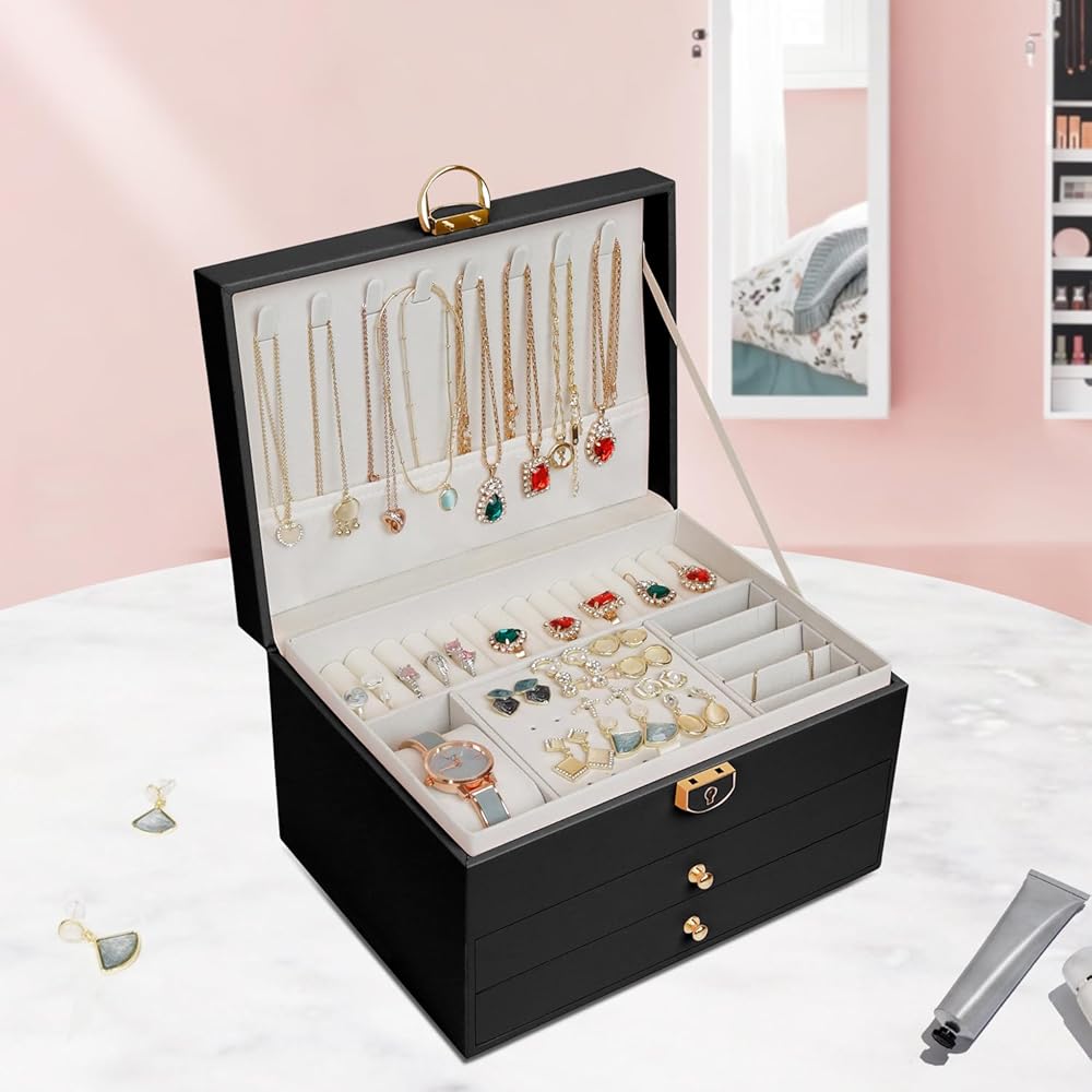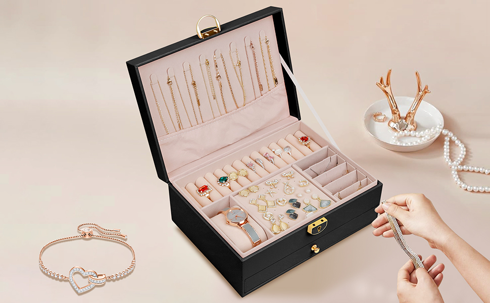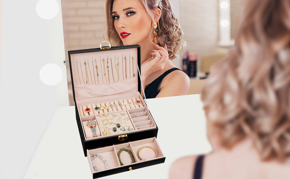 مانجوتري صندوق منظم مجوهرات للنساء، صناديق عرض وتخزين المجوهرات من طبقتين من الجلد الصناعي (اسود)