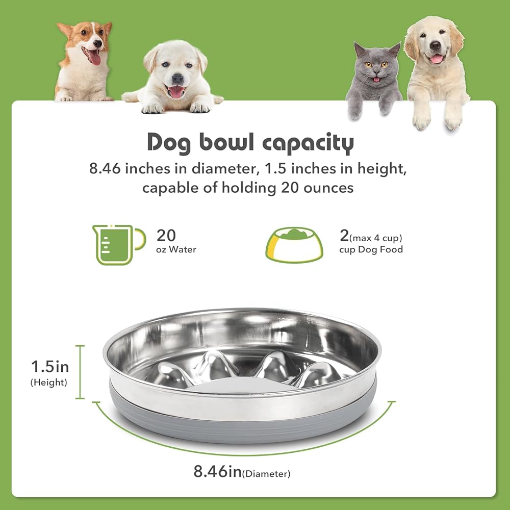 قطر الحجم: أوعية طعام الكلاب ذات قاعدة تغذية بطيئة: 22 سم (8.5 بوصة). ارتفاع الوعاء: 1.5 بوصة (3.81 سم). الكلاب الصغيرة والمتوسطة الحجم. يمكن أن يضيف وعاء الكلاب ذو التغذية البطيئة المصنوع من الفولاذ المقاوم للصدأ 20 أونصة لكل وعاء